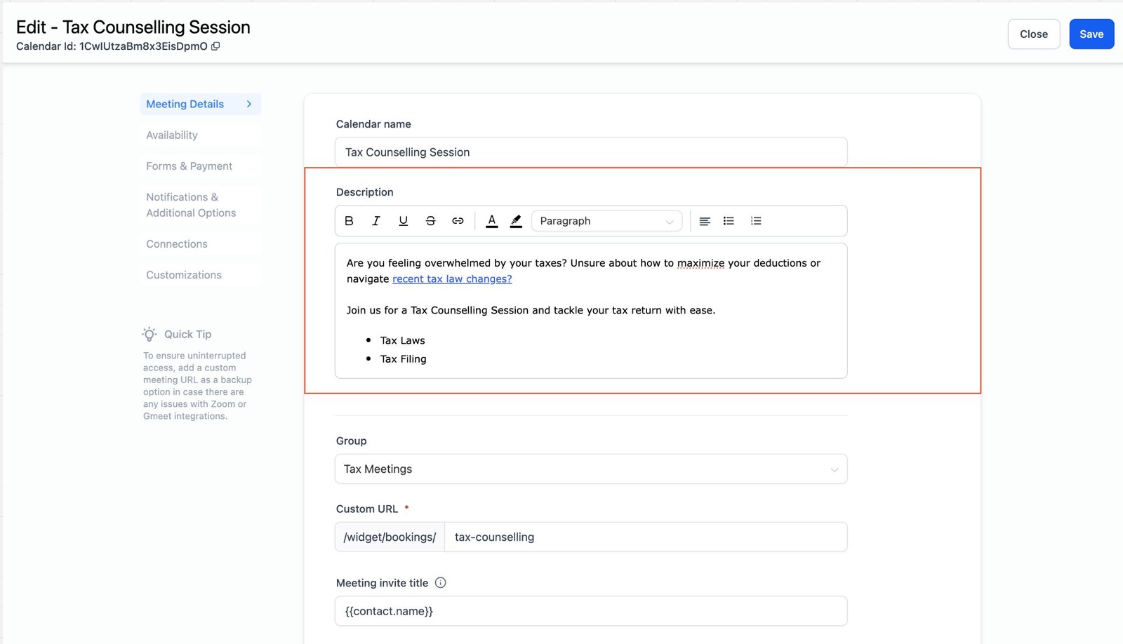 - Under the calendar description, you will find the rich text editor options.