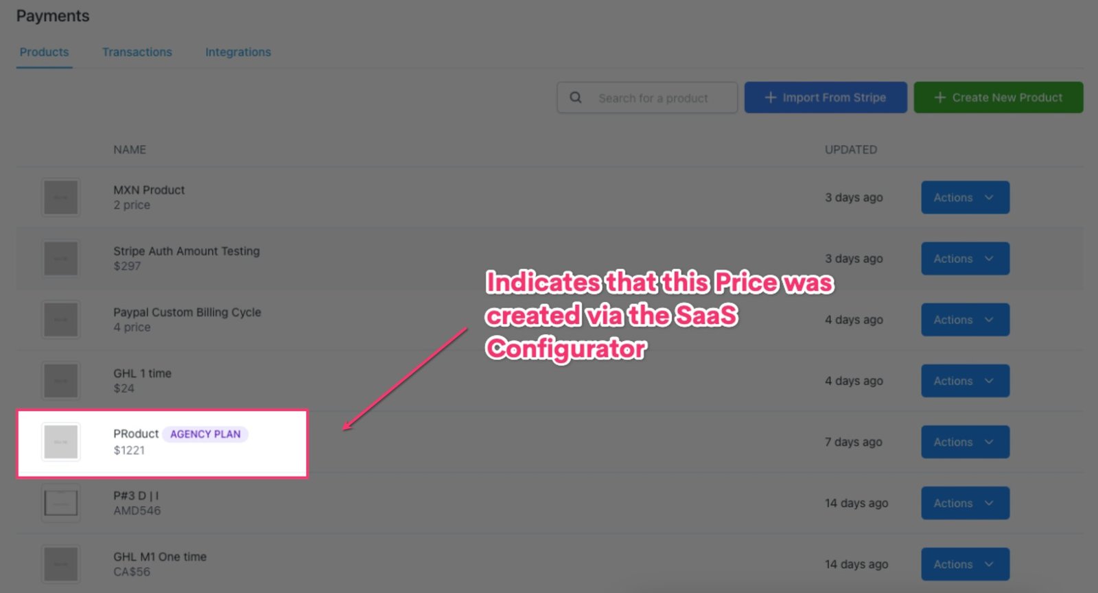 • If you need to change the price of a product created via the SaaS Configurator, edit the price in Stripe and then use the “Import From Stripe” button to import the new price, which will create a new HighLevel Product with an “Agency Plan” tag, which you can then go select in your Funnel or Website page settings.