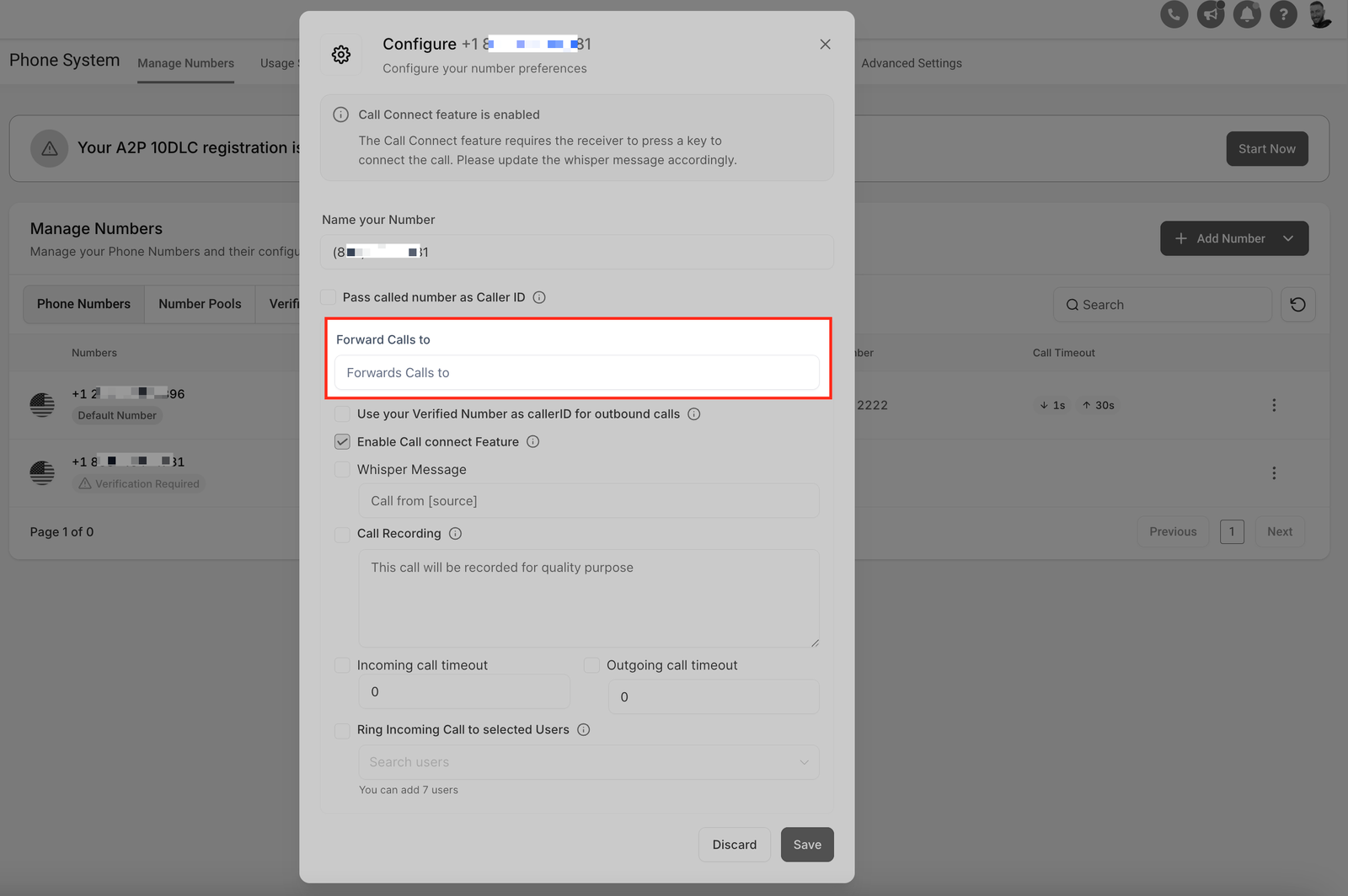 - Assign call forwarding to the phone number assigned to your AI Agent.