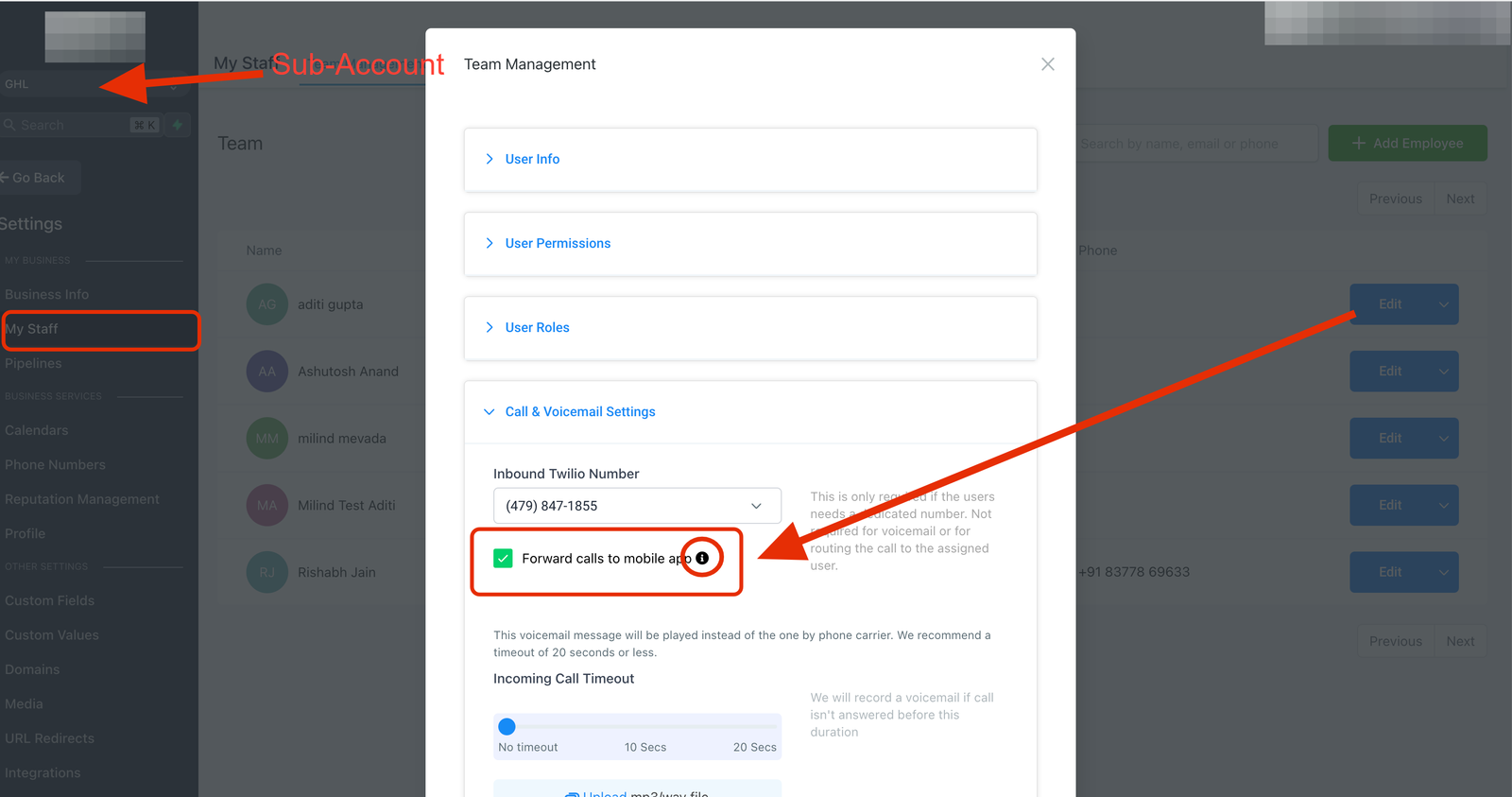 2. Scroll down to ‘Call and Voicemail Settings‘ > Assign a Twilio number to the user