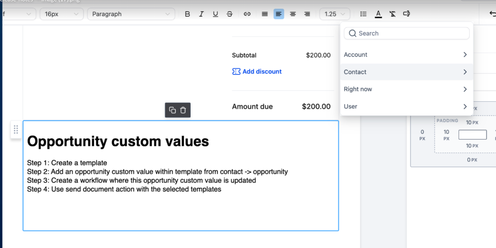 - Opportunity Custom Values in Templates: You can now leverage Opportunity Custom Values directly within document templates, available exclusively through workflows.
