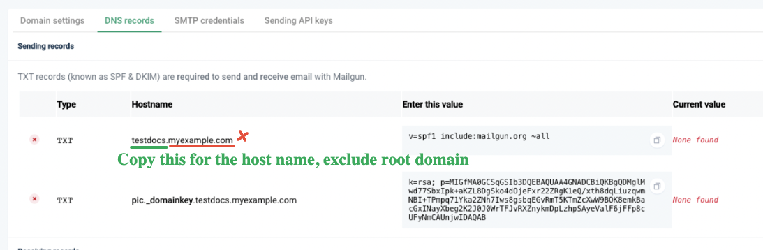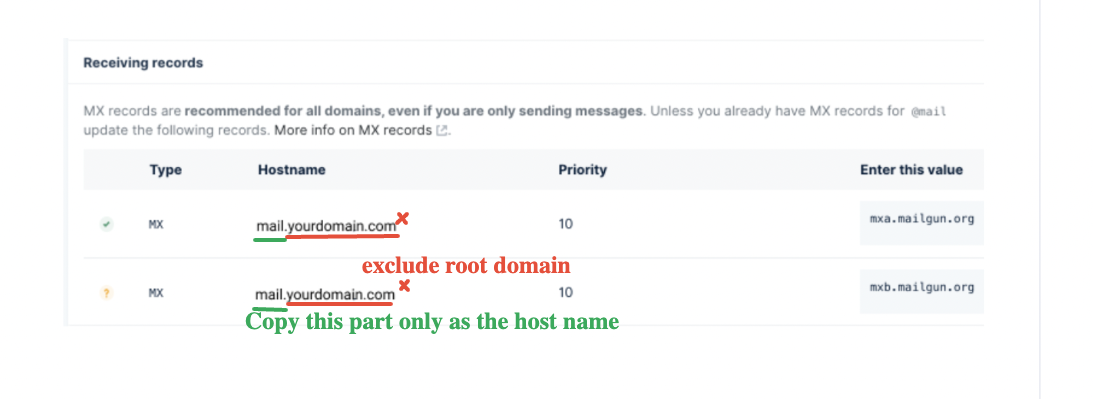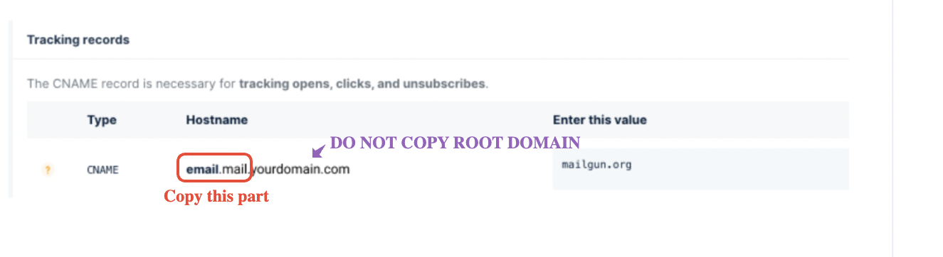 Head back to Mailgun to copy the host name, it’s a bit tricky but the key here is to copy everything from the beginning until the subdomain part, DO NOT copy the main domain