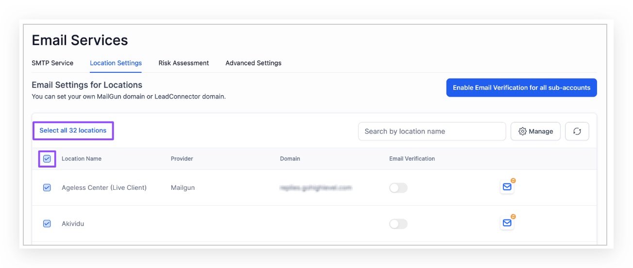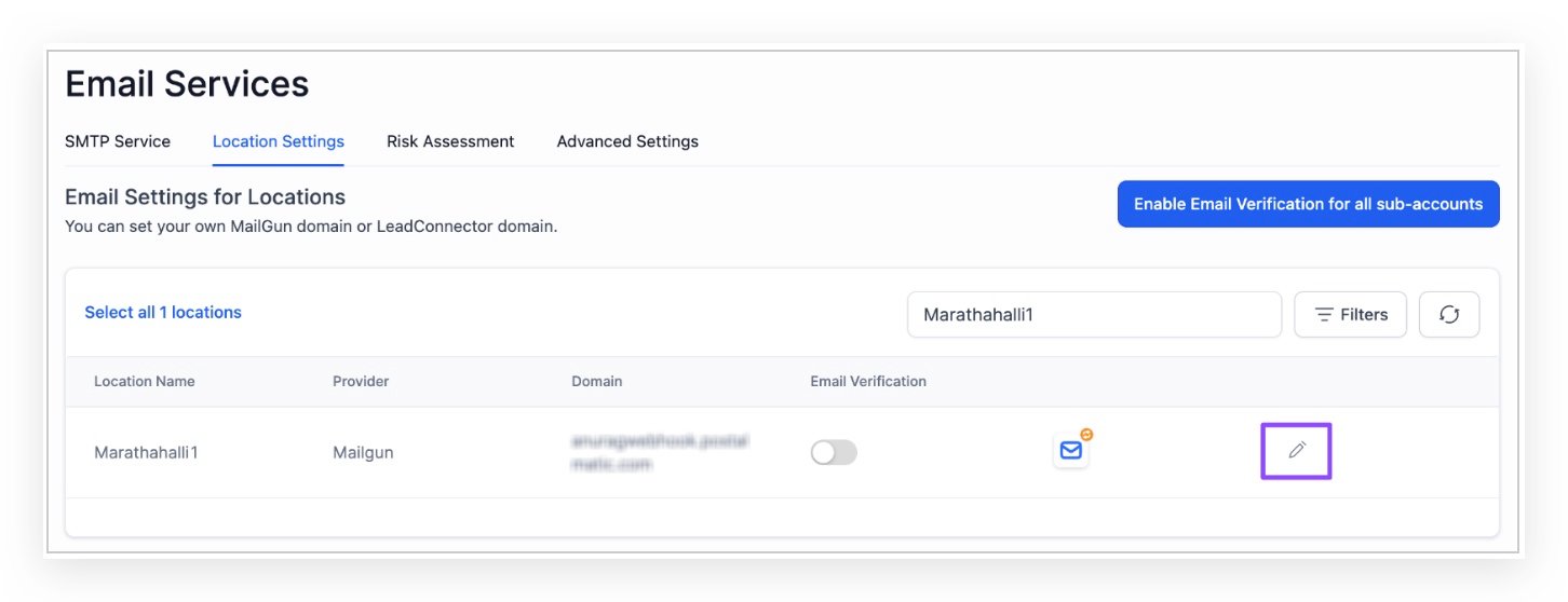 - Navigate to Agency Settings -> Email Services -> Location Settings and Click the “Filter” button. All your sub-accounts email service records will be available on the page.
