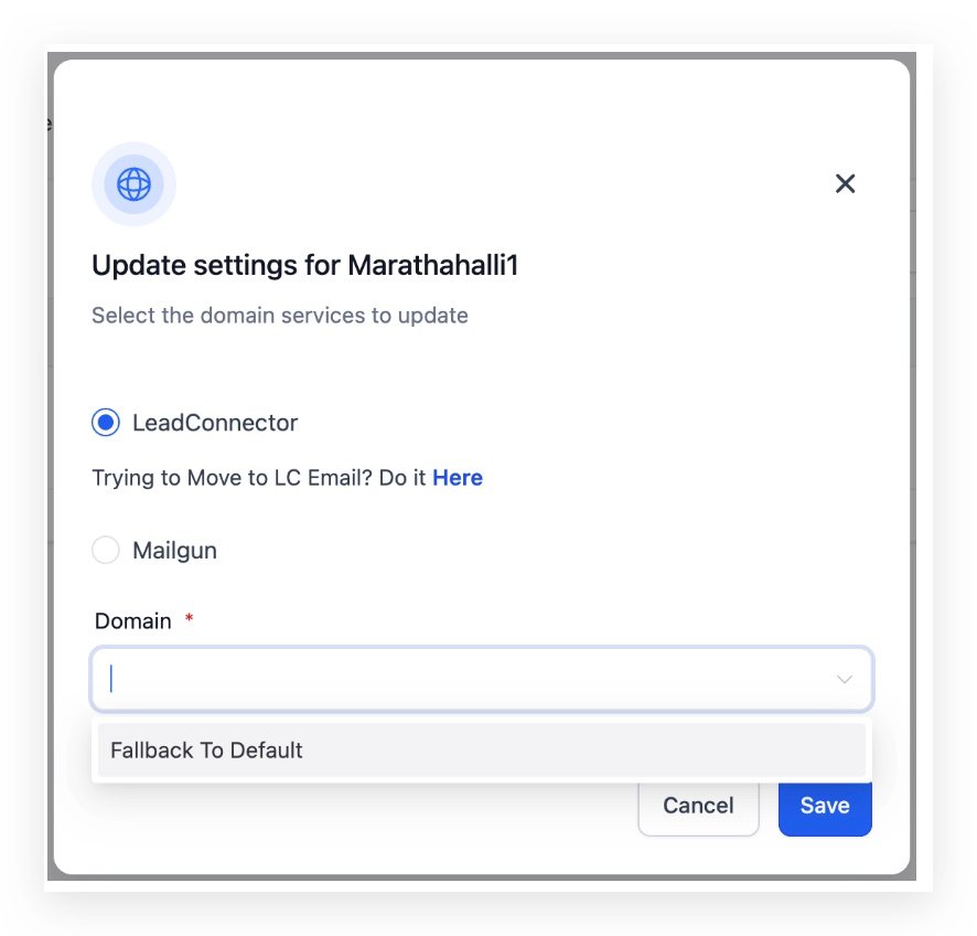 - Choose the LeadConnector and select your dedicated domain or set Fallback to Default(Agency default domain) and save the settings.