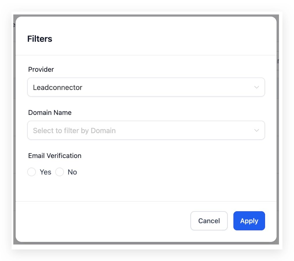 - You also have the flexibility to combine filters to narrow down your search further. For example, you can filter sub-accounts by both domain name and email validation status simultaneously.