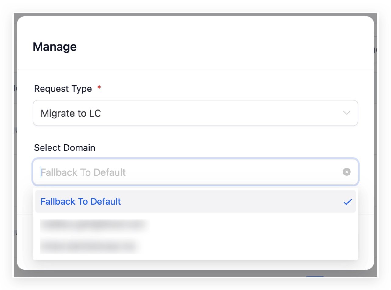 - Click the “Manage” button and select Migrate to LC under the Request type. Click Confirm to select the LC dedicated domain.