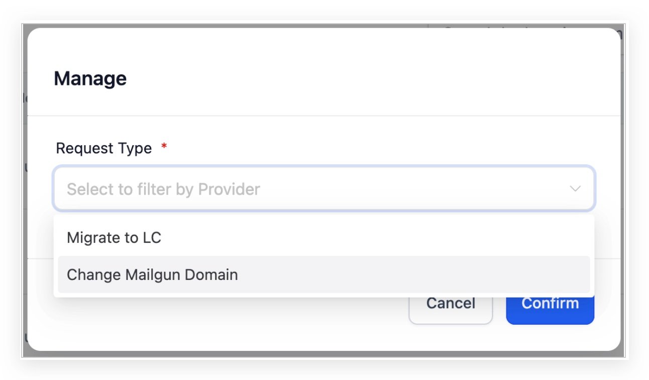 - Choose the dedicated domain and click Confirm to Migrate the sub-accounts to LC Email.