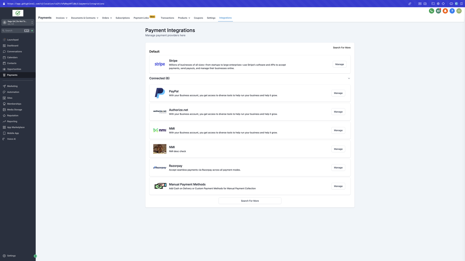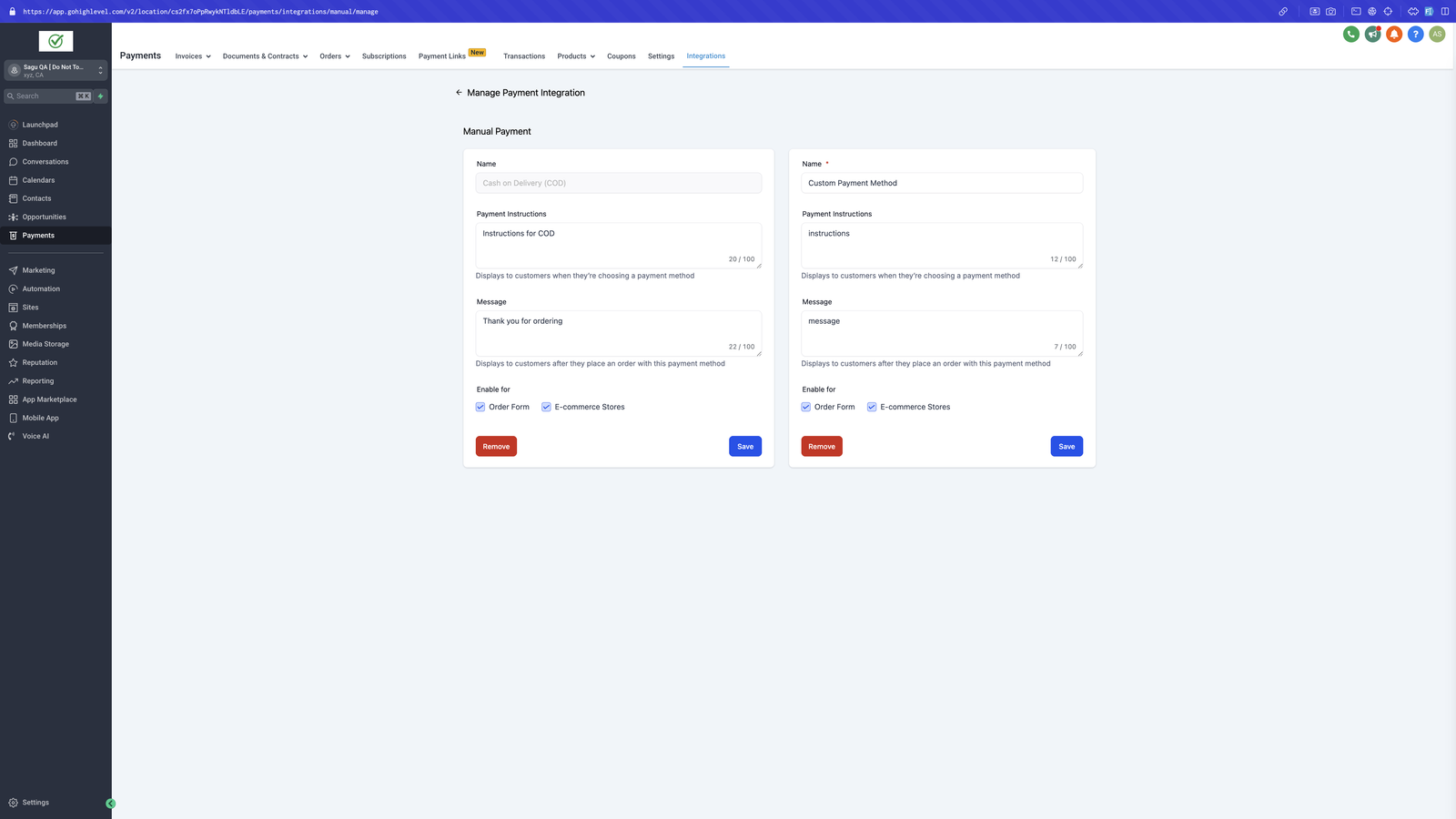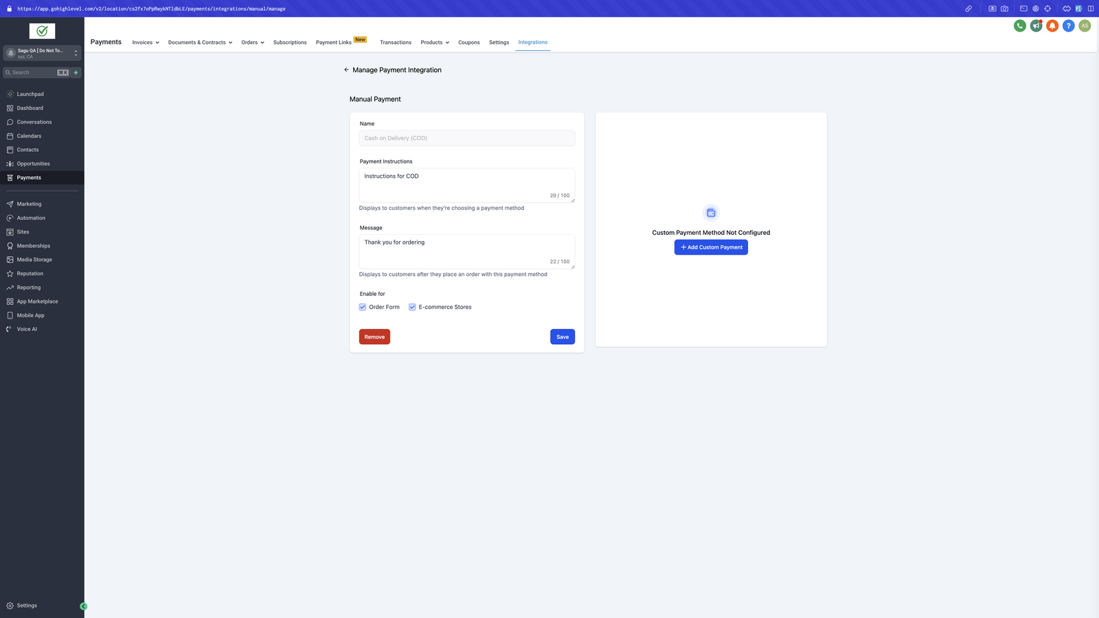 1. Navigate to Manual Payment Methods: Go to Payment > Integrations > Manual Payment Methods.