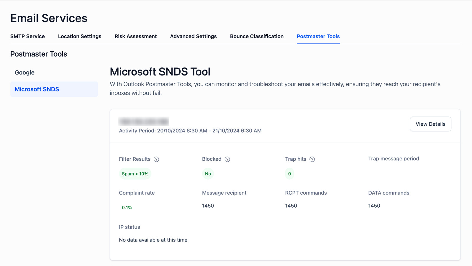 We are excited to offer a new feature for our customers who have purchased IP subscriptions from us—IP Status Monitoring through Microsoft SNDS (Smart Network Data Services) integration. This feature allows you to monitor your IP addresses’ deliverability health, helping you avoid potential email deliverability issues.