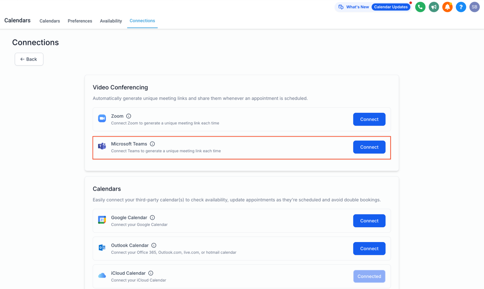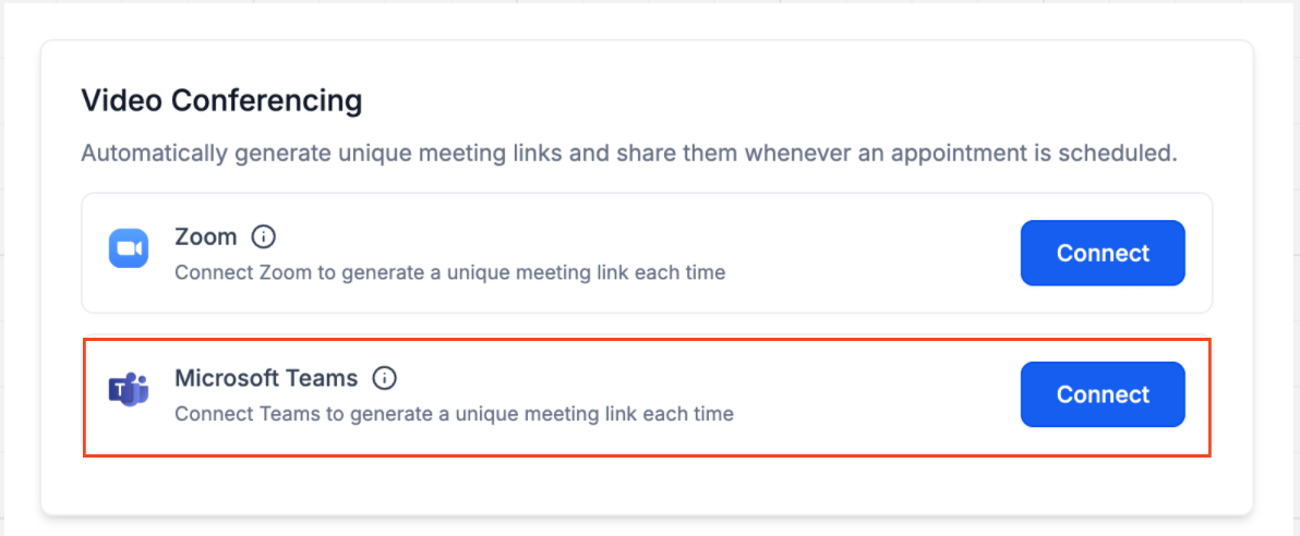 • Connecting an Outlook calendar does not automatically link Microsoft Teams. To connect Teams, navigate to Calendar Connections > Video Conferencing and connect it separately.