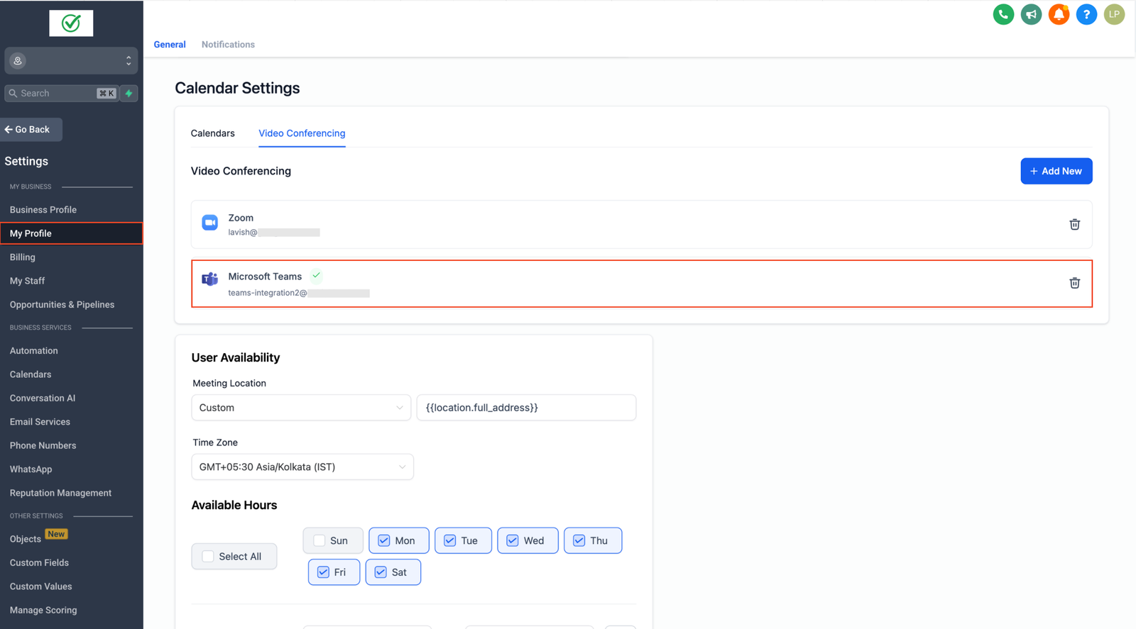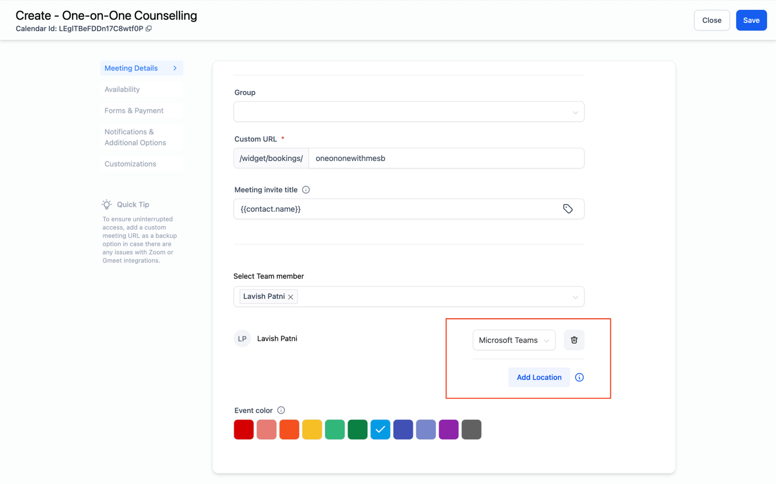4. Choose the team member, ensure they have successfully integrated Microsoft Teams, then select Microsoft Teams as the meeting location and click Save.