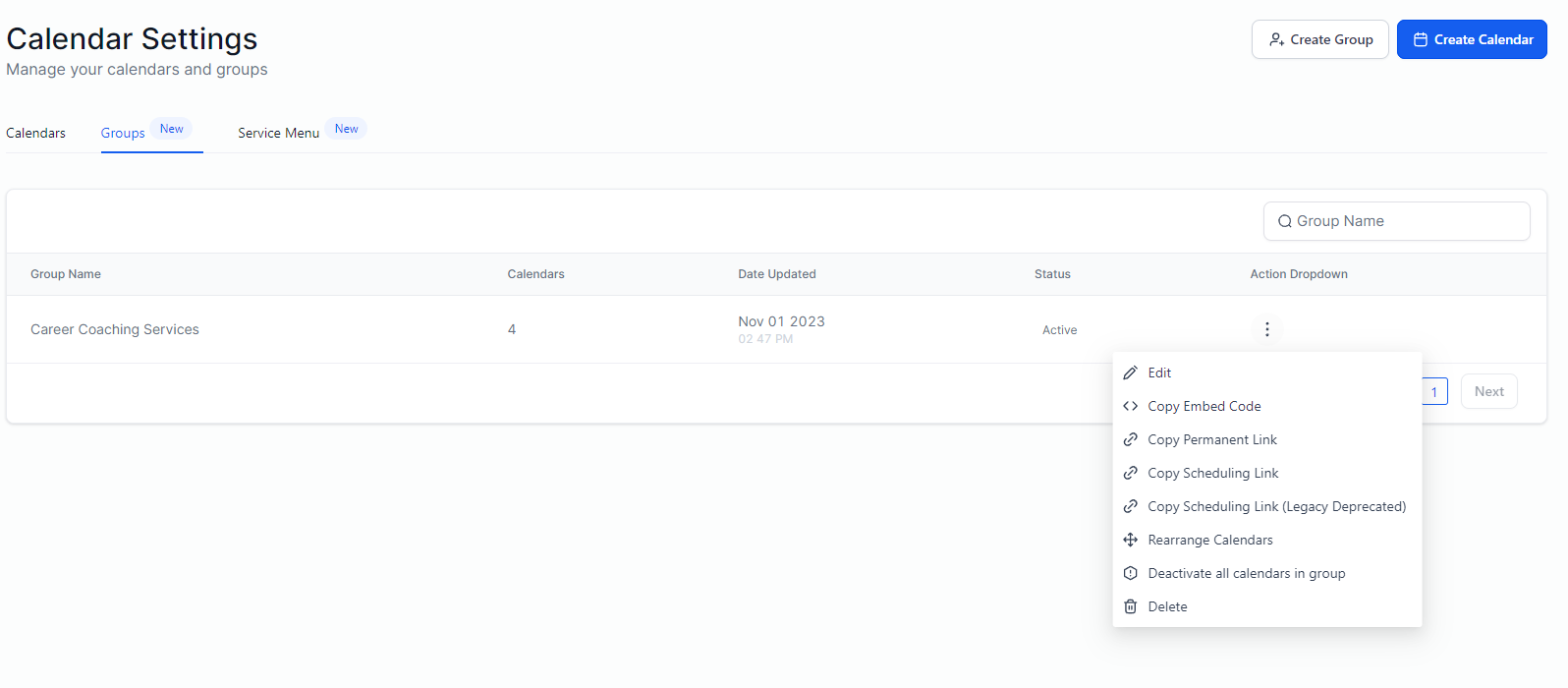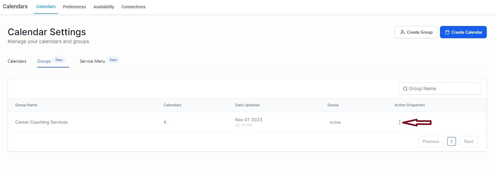 To do that, go to Calendar Settings and click on “Groups”. Look for the Group Calendar you want and click on the 3 dots which corresponds to the Action dropdown.