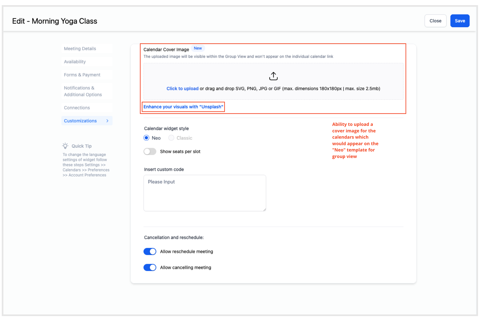 Answer: Adding a calendar cover image enhances the visual appeal and professionalism of your calendar, making it more engaging for users. This visual enhancement aligns well with the Neo Template’s modern and polished design.