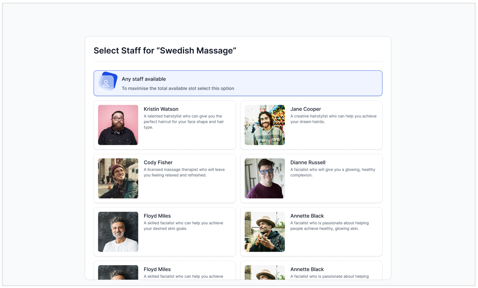 - Staff Selection: new enhanced experience for Staff selection for a particular service. If the calendar has enabled staff selection for it from the calendar settings.