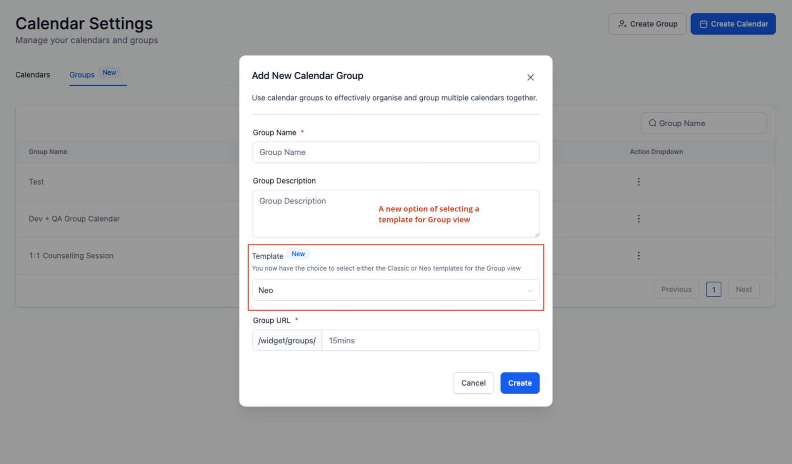 Answer: To create a group with the Neo Template, follow these steps: Access Calendar Settings, select Groups, click on “Create Group,” choose the “Neo” template, fill in group details, and click “Create.”