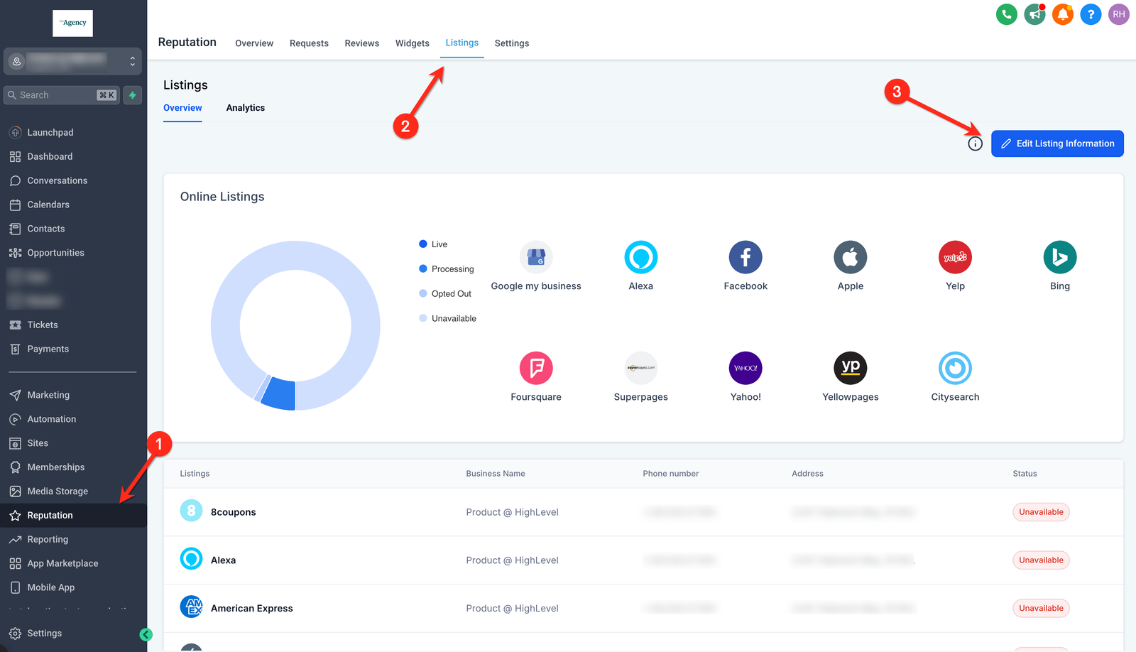 Location View -> Reputation -> Online Listings