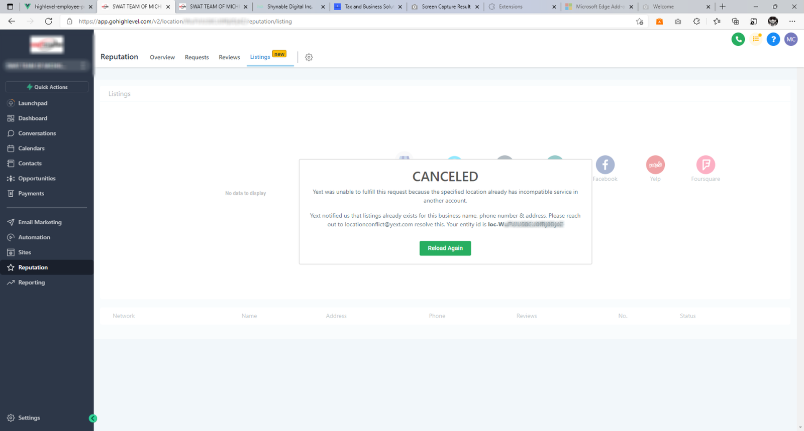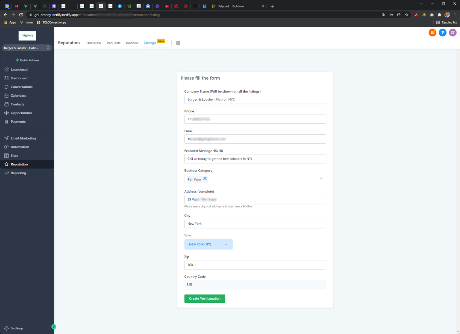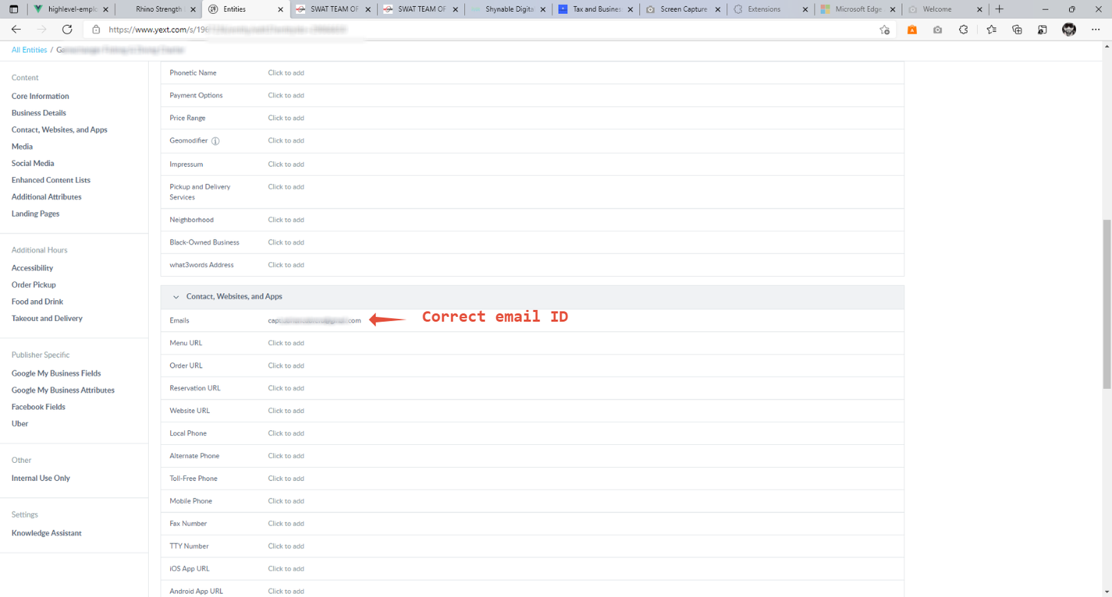 Agency users can log in to Yext to manage Yext listings. For this example, the location had filled a PO Box address and used an invalid email ID in their listing form.