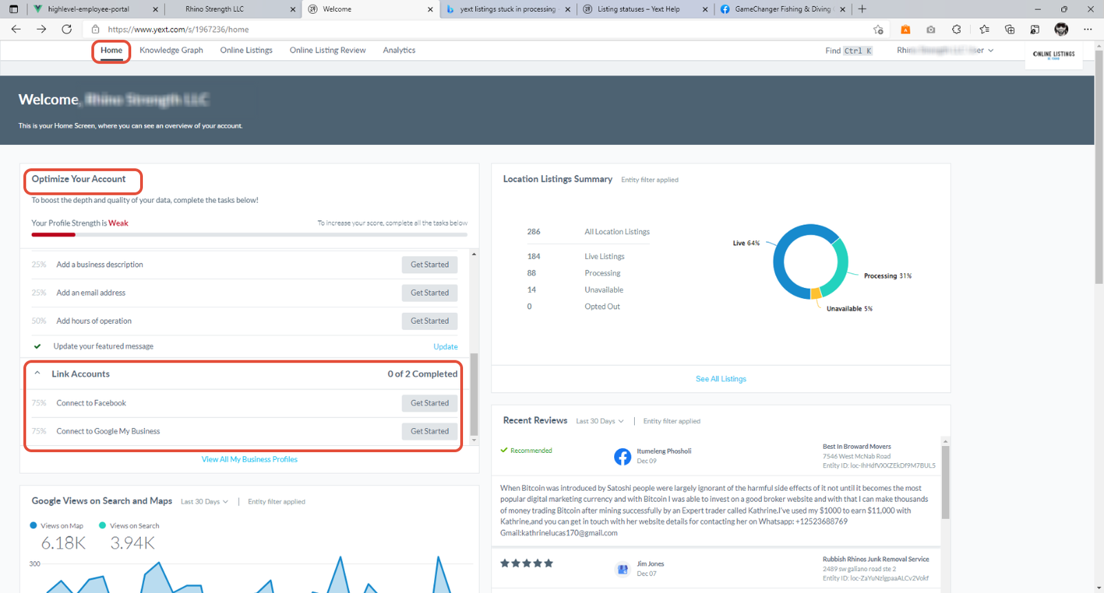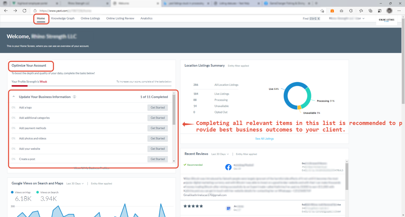 Please login to Yext as mentioned in Q4 below. Once you are logged in, go to “Home” and check out the “Optimize Your Account” card.