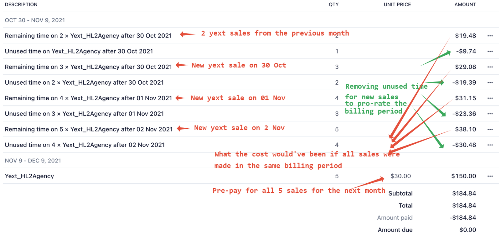 We do pro-rated billing to ensure you receive a single invoice in the same billing period, even though the sales are made on different days within the month.