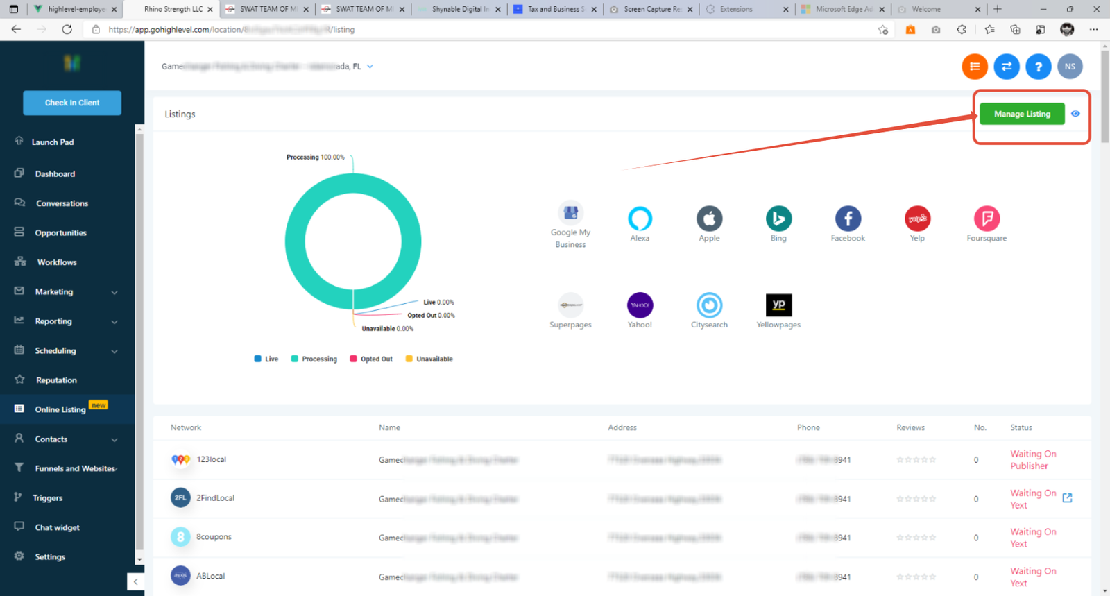 1. Go to the location view -> Reputation -> Online Listings and click on the “Manage Listing” button on the top right.