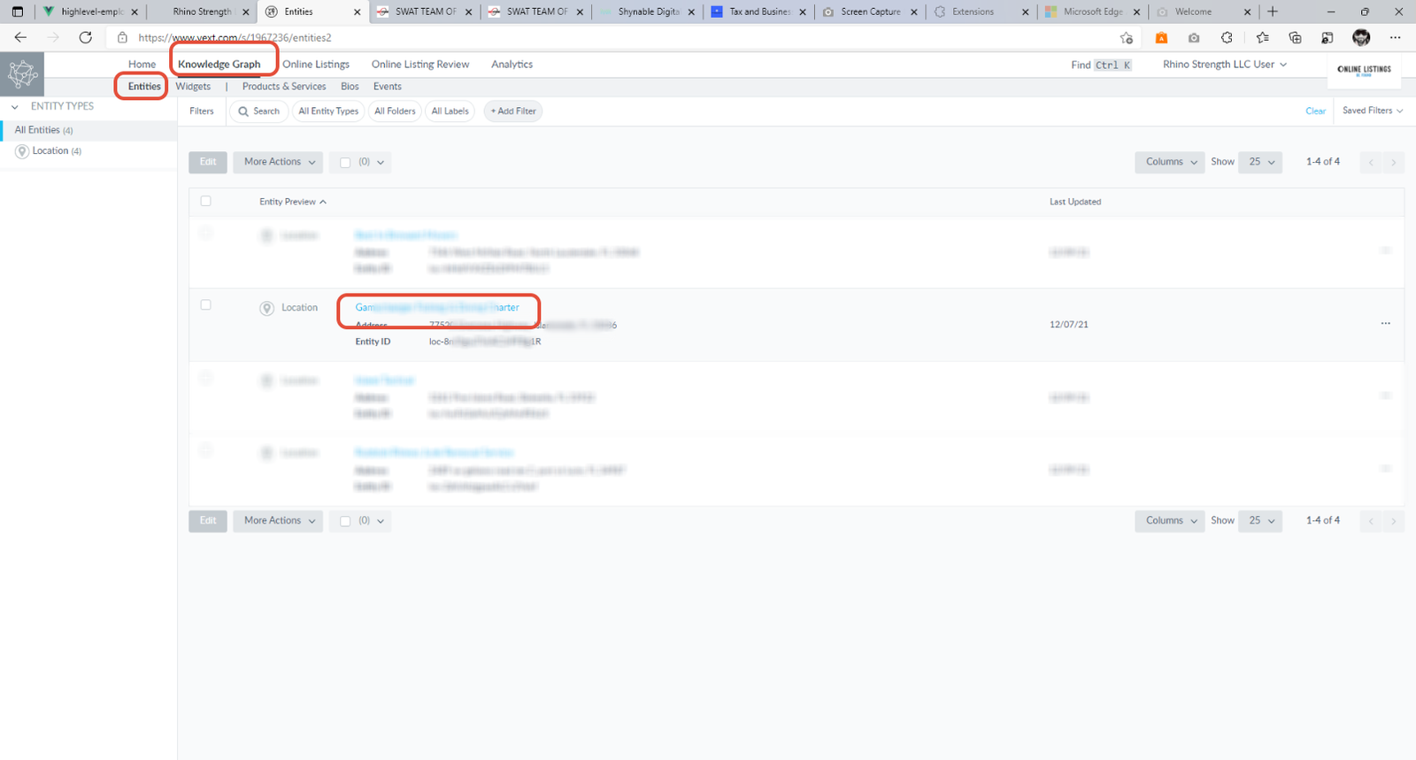 - 4. Once you log in to Yext go to Knowledge Graph -> Entities -> Select the correct Entity.