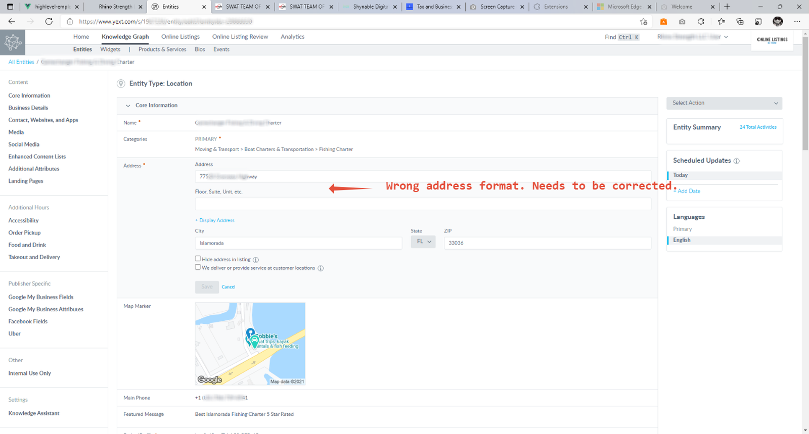 4. Once you log in to Yext go to Knowledge Graph -> Entities -> Select the correct Entity.