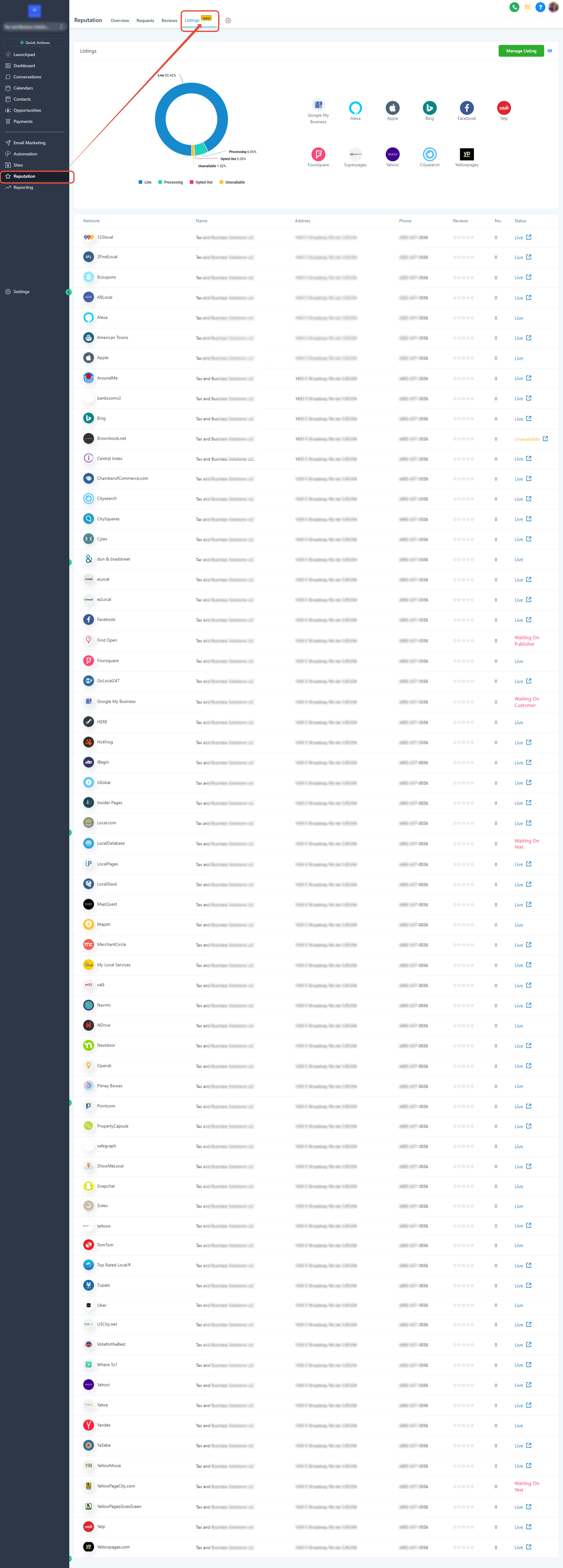 - 1. Go to the location view -> Reputation -> Online Listings and click on the "Manage Listing" button on the top right.