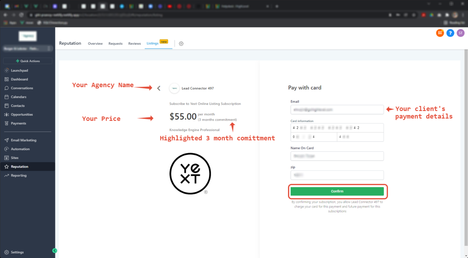 Yext is a great complimentary service that can be deployed alongside your services and can be resold through HighLevel with a markup price of your choosing… cha chinggg!