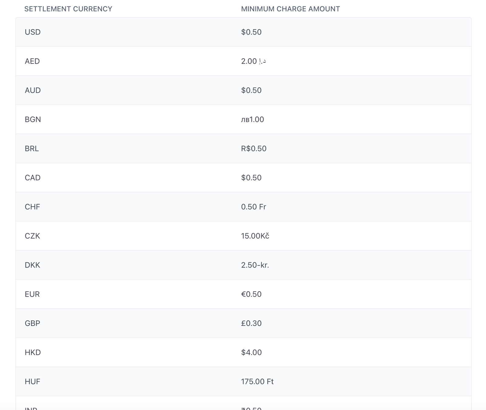 For minimum and maximum charges, refer to https://stripe.com/docs/currencies