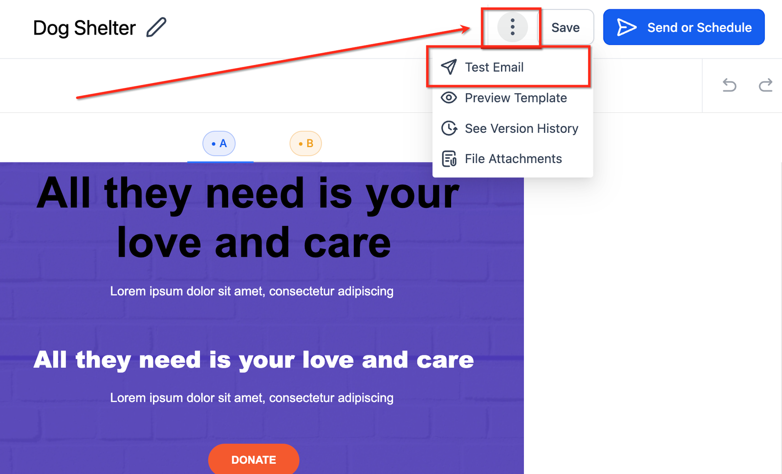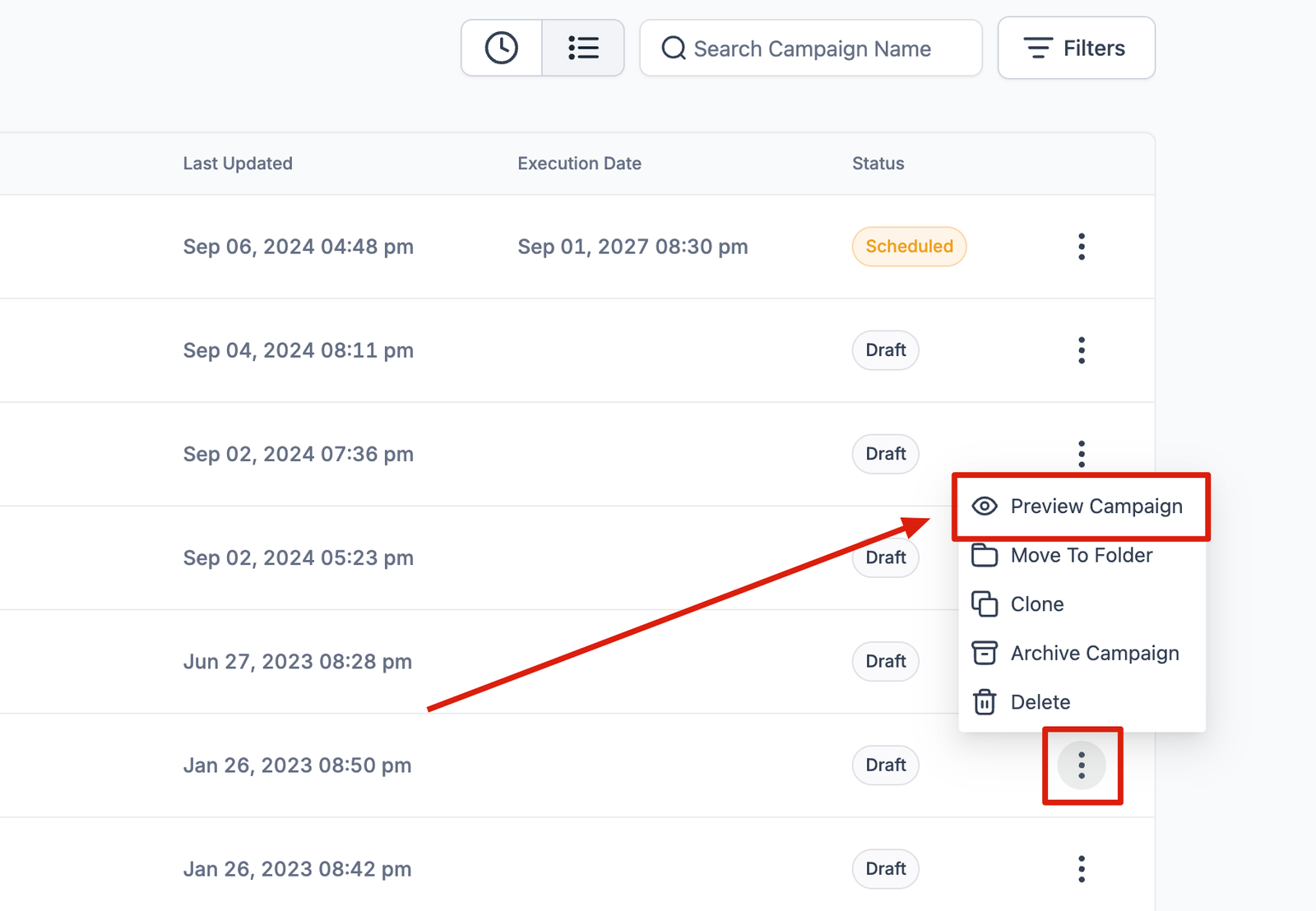3. Once the Campaign/Template edit, on the right-hand side corner beside the Save option, there is the three-dot icon. Click the icon.