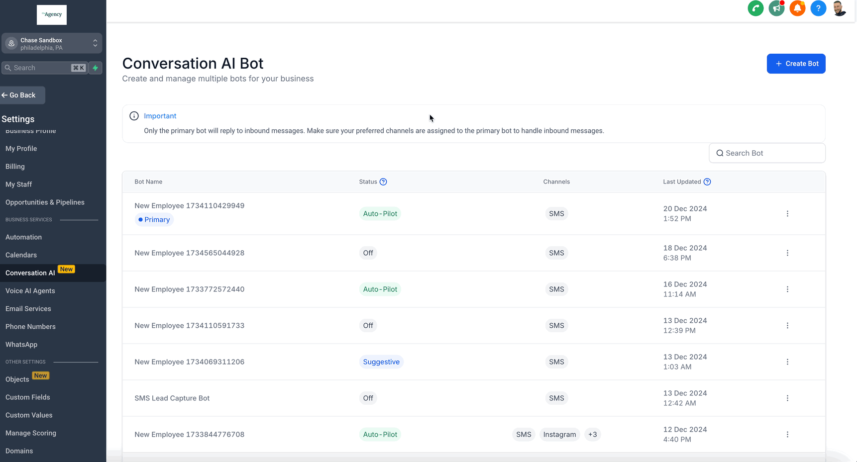 Primary bots handle conversations originating from any assigned communication channels, such as SMS, Facebook, or live chat, as long as those conversations are not already being handled by conversation AI bots inside a workflow. They act as the default responder for your business’s communication channels and ensure seamless interaction with customers.