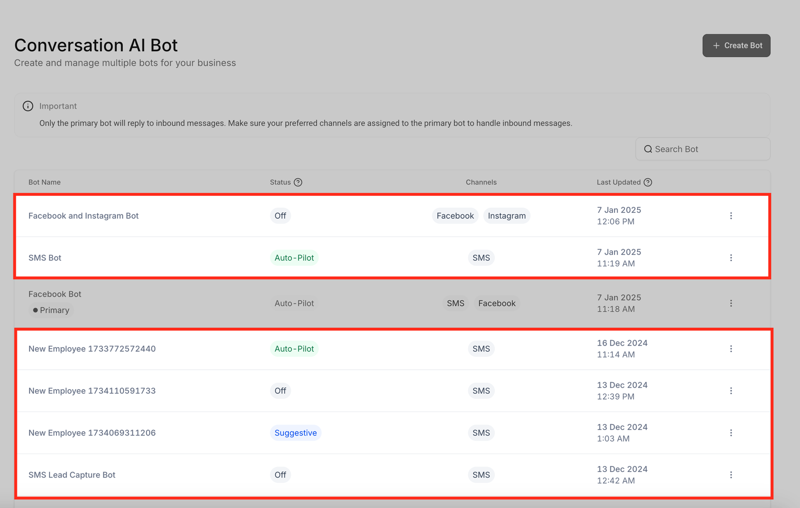 If channels are missing from the primary bot’s configuration, it won’t be able to respond to messages on those platforms. Make sure all relevant communication channels are assigned to the primary bot to avoid interruptions in customer interactions.