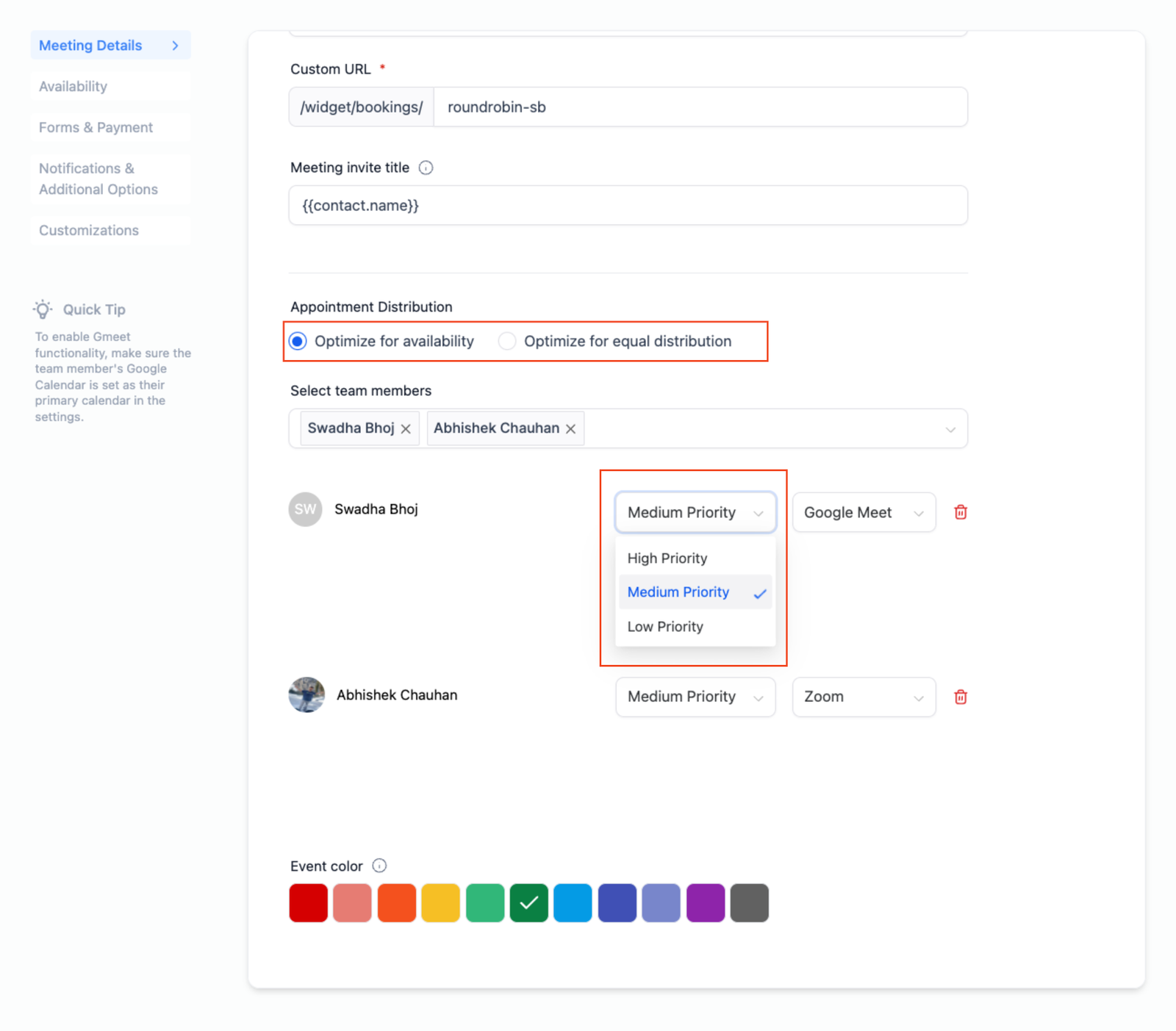 Now, let’s say there’s more than one available person at the selected time. GHL lets you decide who gets the meeting first. This cool feature helps you manage your team automatically and respond quickly, all while achieving different team goals: