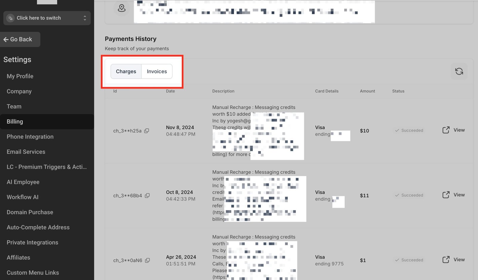 Sub-accounts now have easy access to their charges and invoices right on the billing page. They can see all charges, including those related to SaaS services and others, linked to their account.