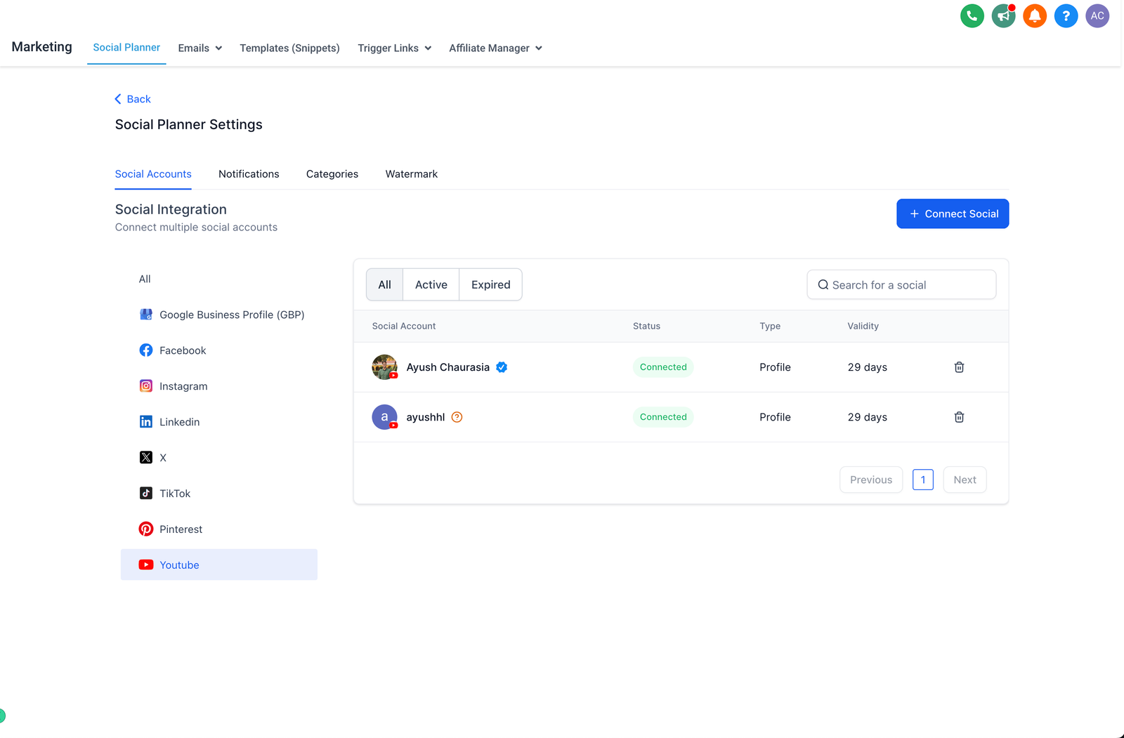 - 2. Connect your YouTube account with Google Integrations and select the account.