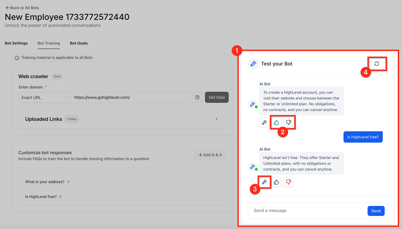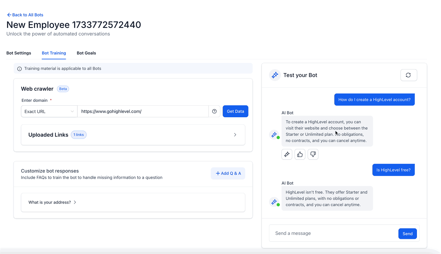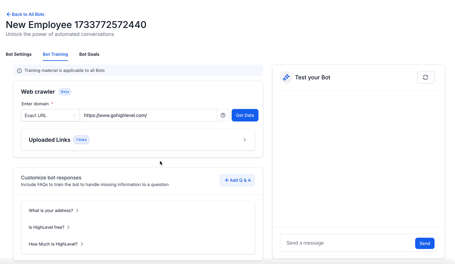 - For example, if you used the URL “https://www.gohighlevel.com/promo” the bot would use the information found on every web page that has a root domain of “https://www.gohighlevel.com/” to train the bot.