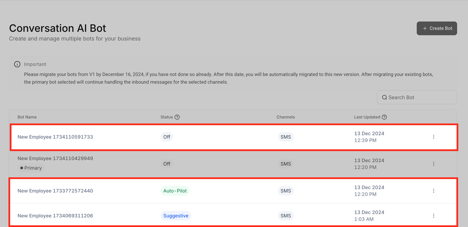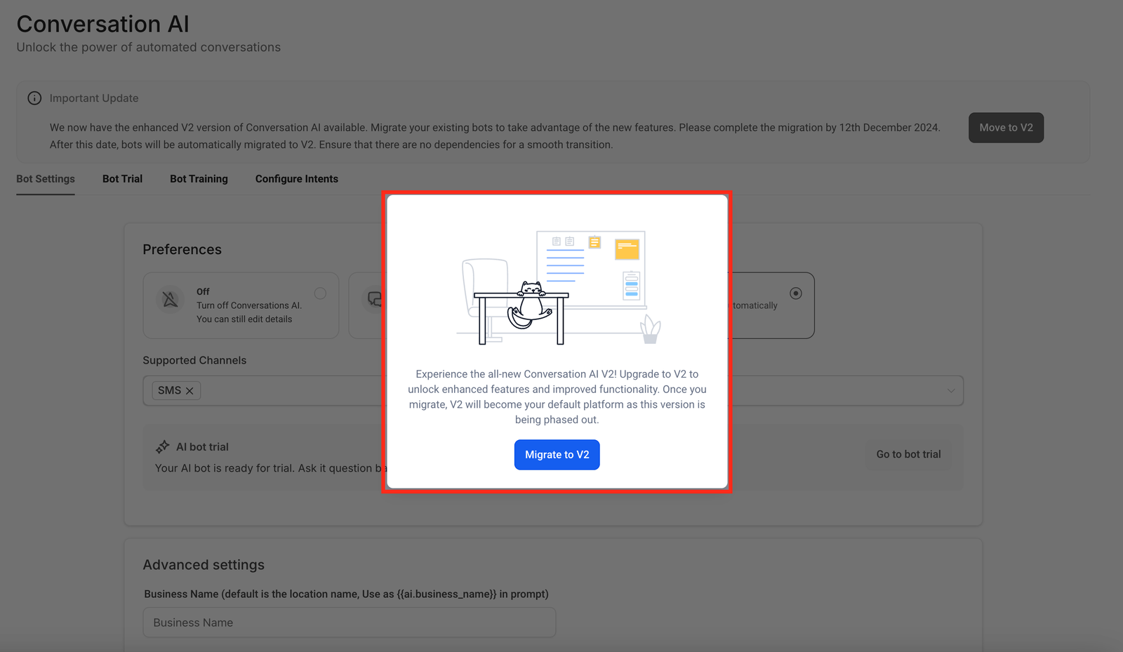 - Confirm the migration process to upgrade your existing bots to the new V2 framework.