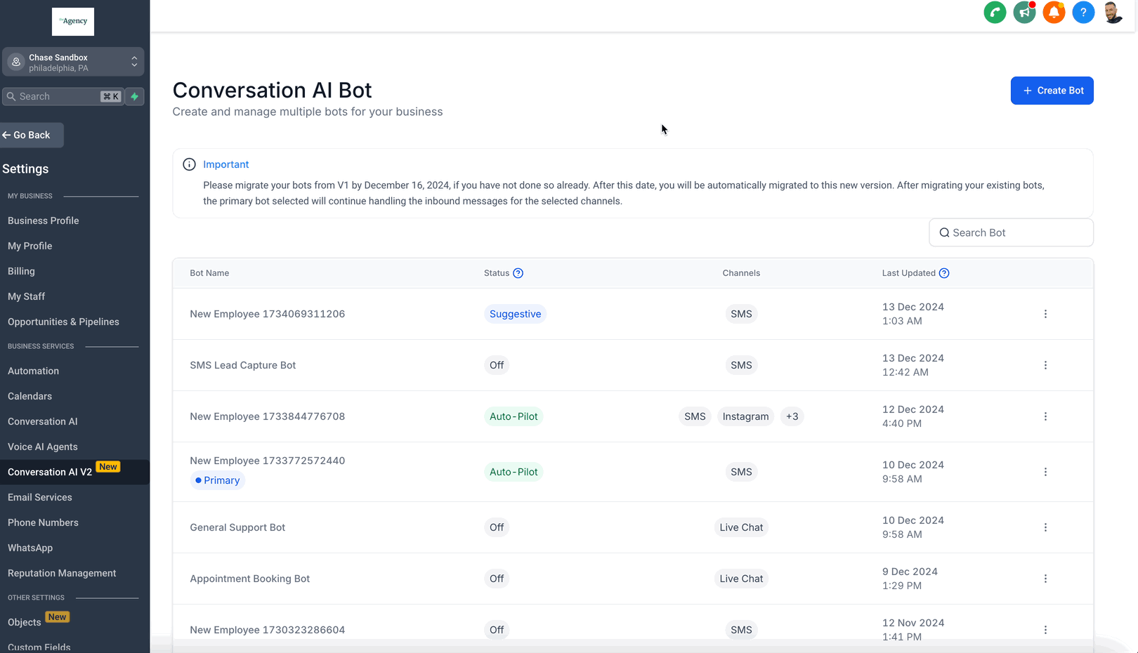 Conversation AI V2 is the upgraded version of our conversational AI platform, designed to provide smarter, more flexible, and efficient customer interactions. This version introduces enhanced bot management, including primary bots and additional bots that can be built to serve individual and unique purposes, all with support for multi-channel communication.