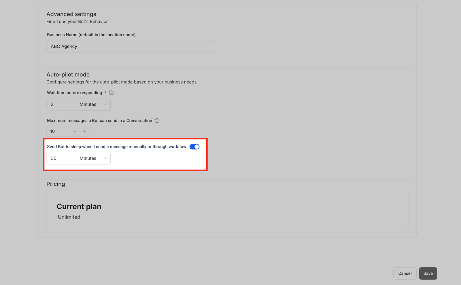 - Adjust this setting to give your customers time to respond before the bot engages again.