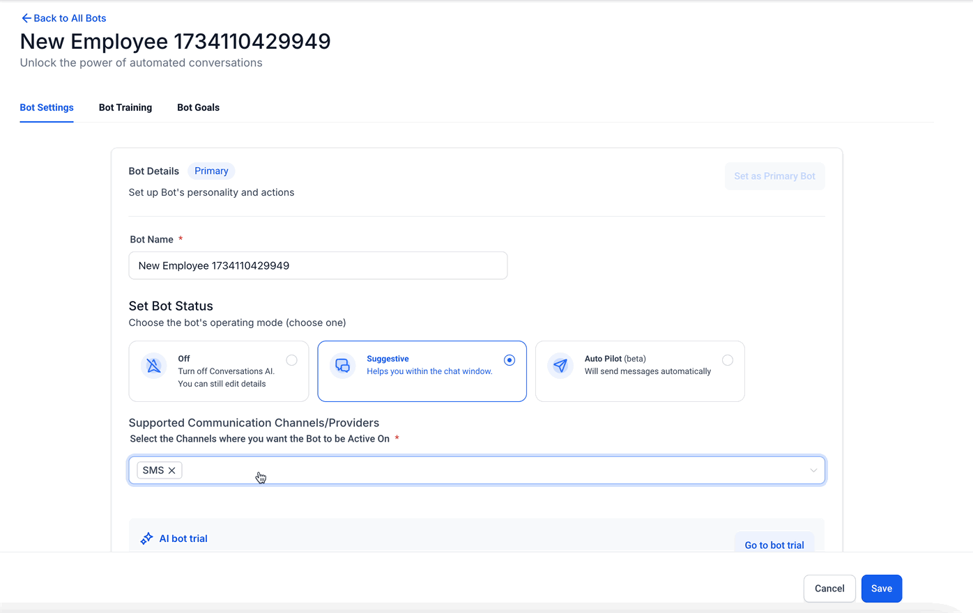 Set the Bot as Primary: Ensure the bot is labeled with the “Primary” tag. Only one bot can be designated as the primary bot at a time.