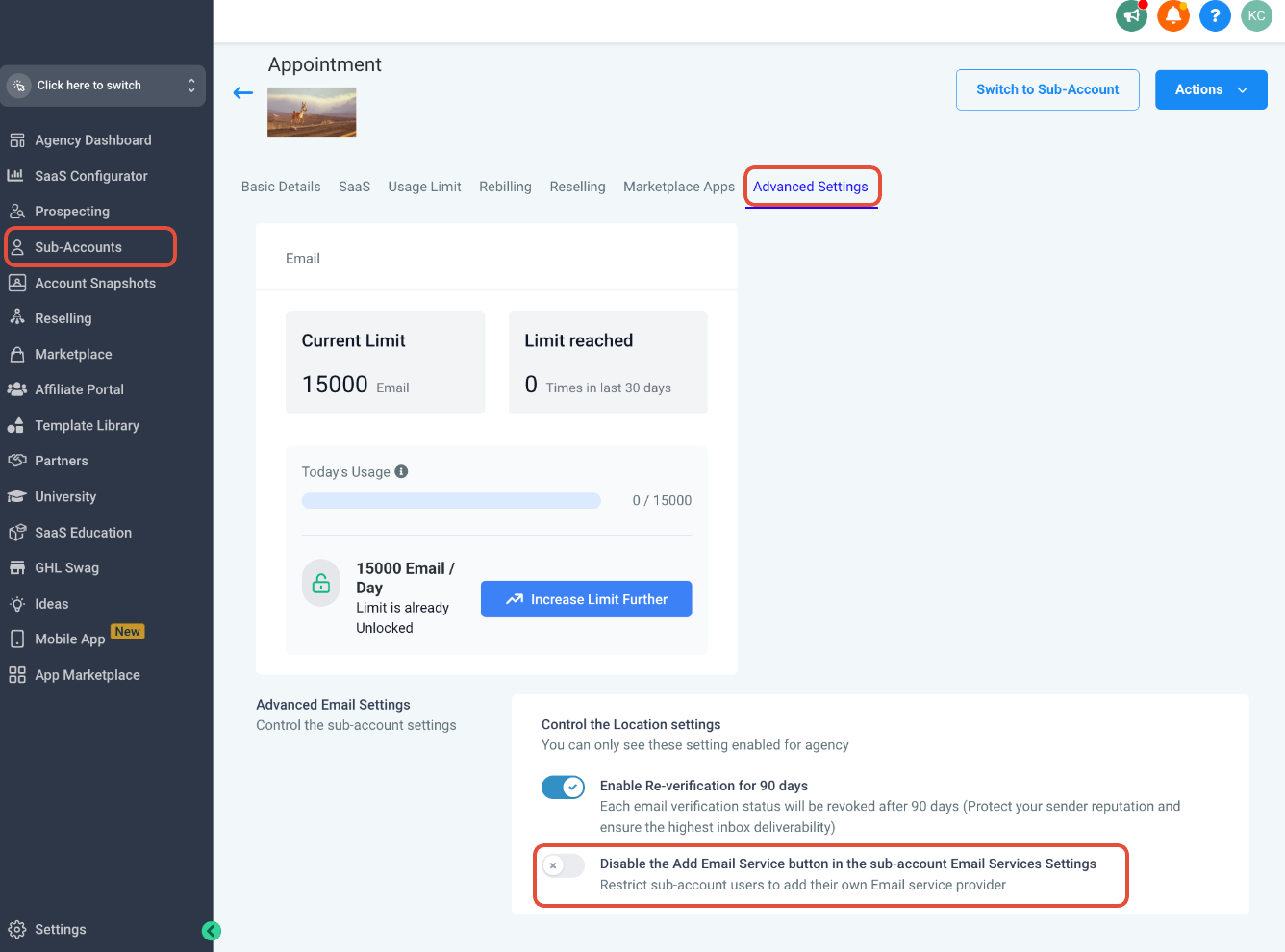 Click on Advanced Settings > Make sure the “Disable the Add Email Service button in the sub-account Email Services Settings” is off