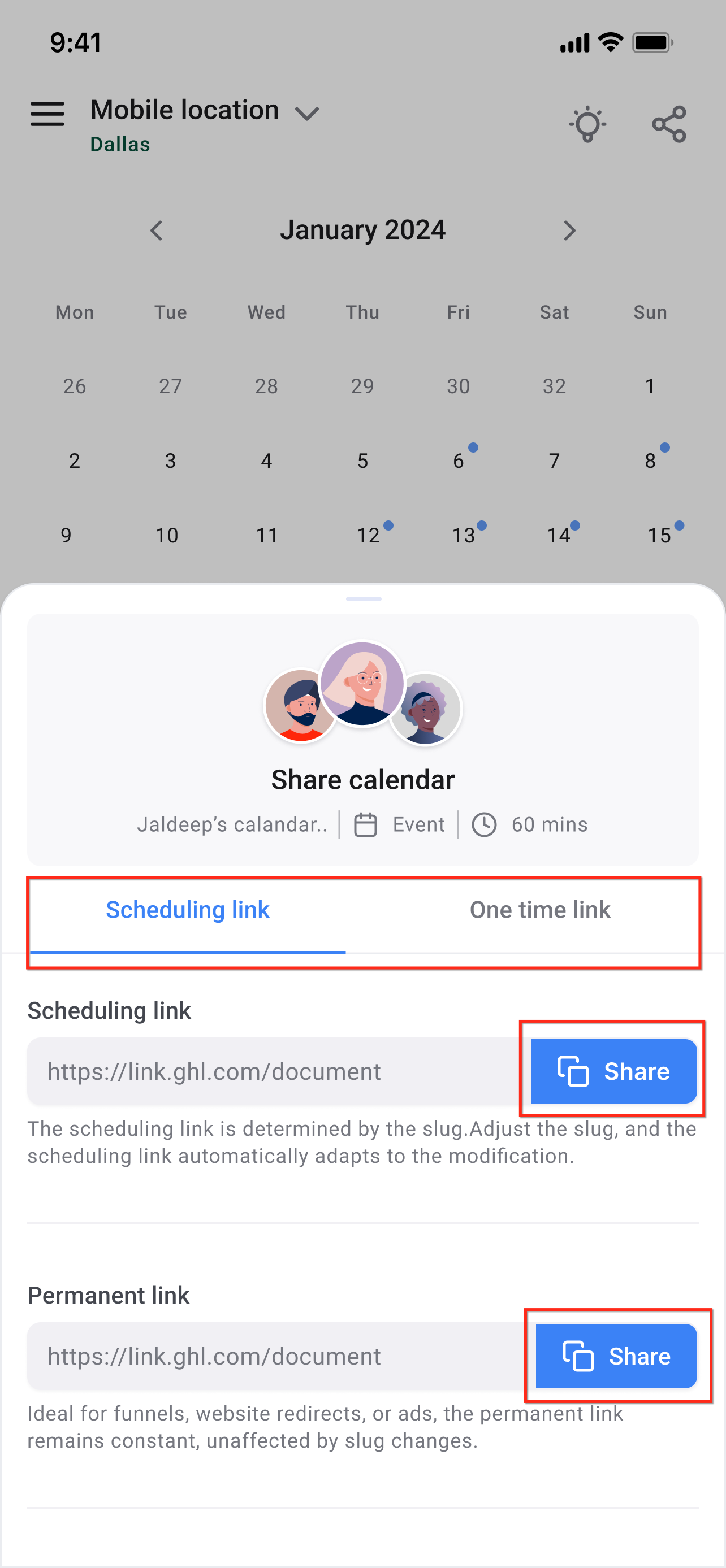 You can share the links of your calendars to potential leads and customers. Links to all the calendars under a particular subaccount can be accessed from the calendars page. You can choose to share a scheduling link, permanent link, or a one-time link based on the circumstance.