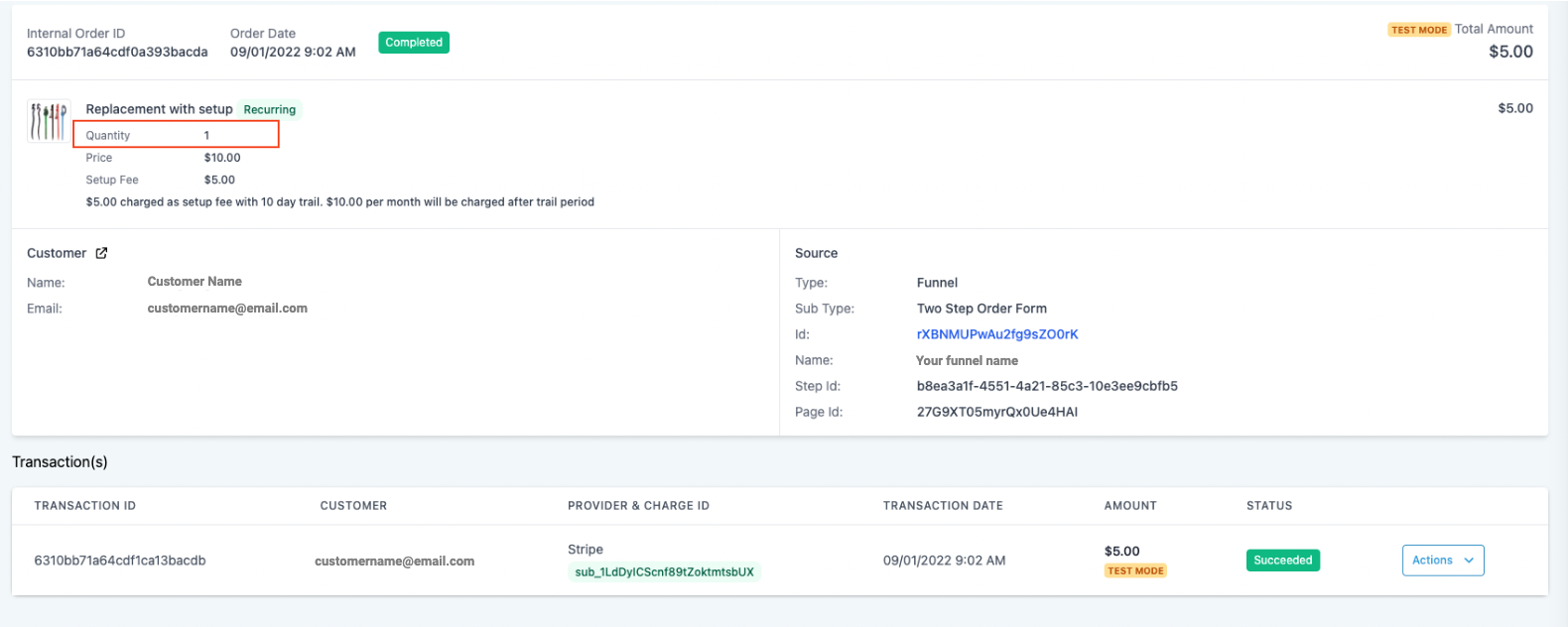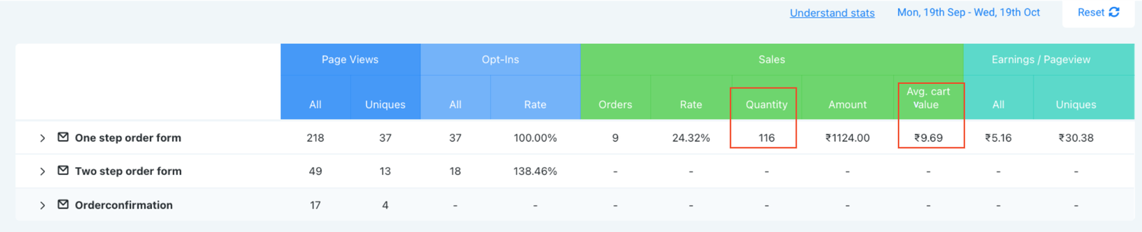 The total quantity of the specific product in that funnel step is shown by Quantity when you are viewing stats for that product sold.