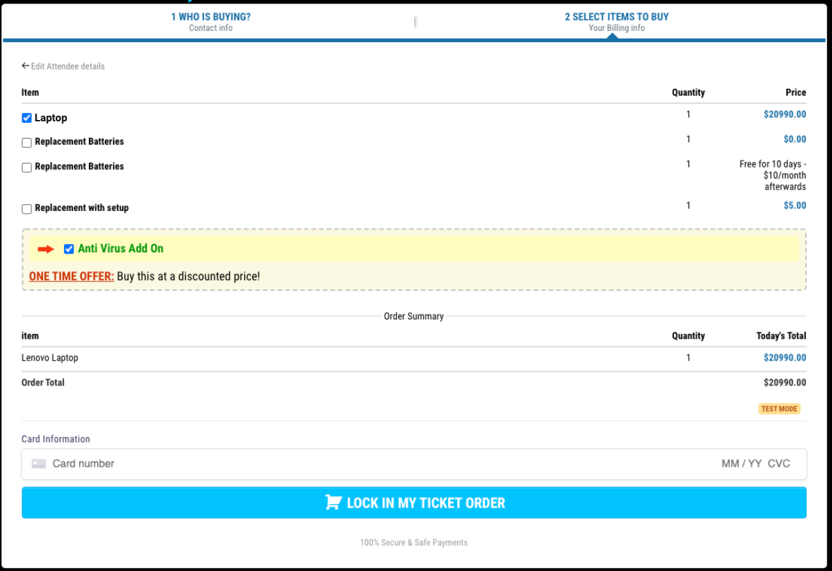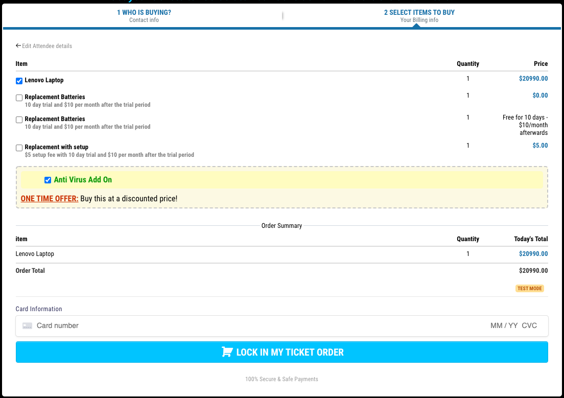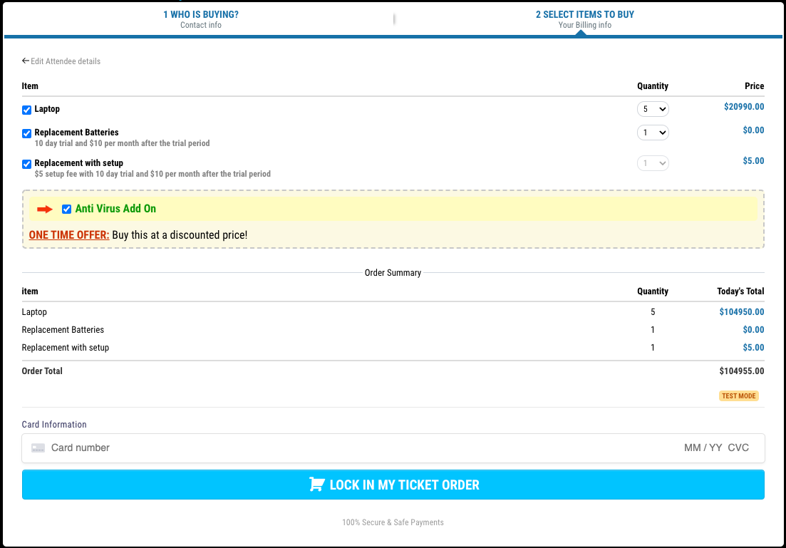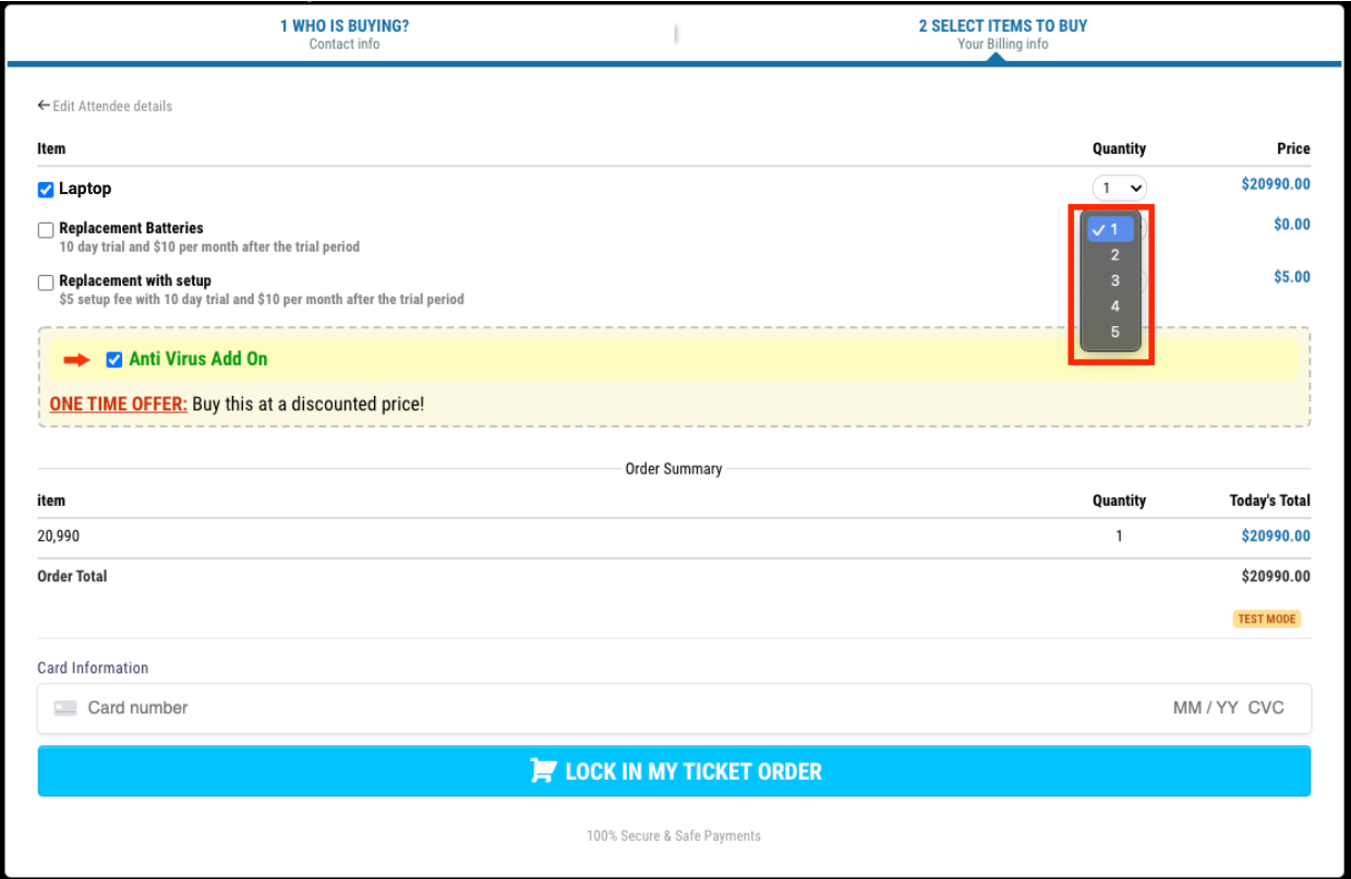 - Multiple items can be purchased from a single order form along with multiple quantities in a single order. (Cart Mode)