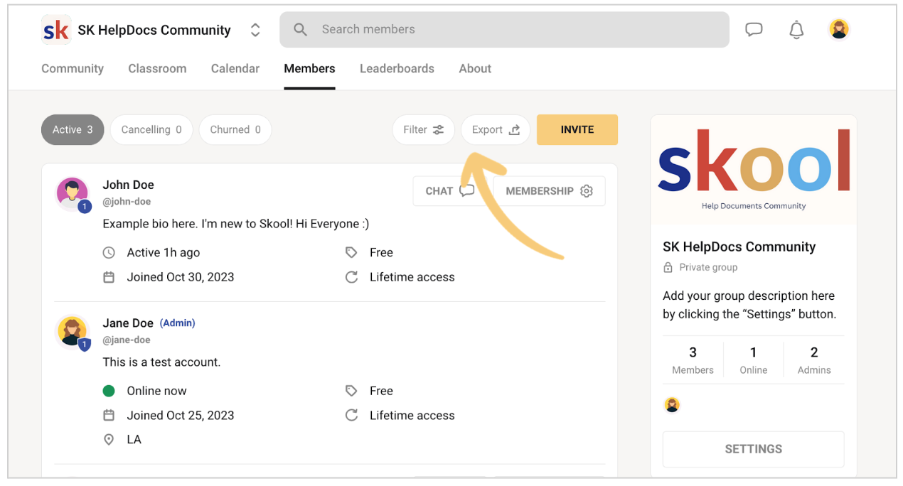 - Export Members: In Skool, navigate to the Members section and use the export function to download the member list as a CSV file, including names, emails, and any custom fields.