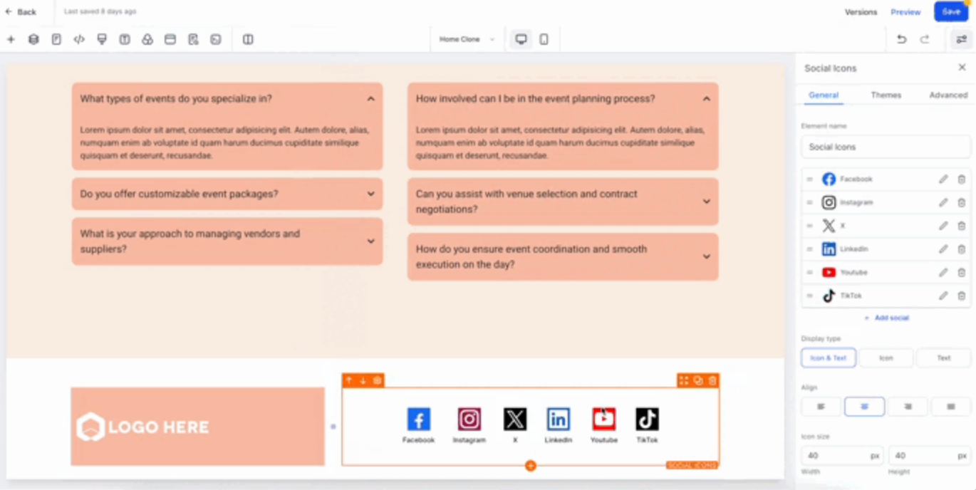 You no longer need to write custom code or spend time creating social bars. This feature offers support for popular social media icons, including Facebook, Instagram, LinkedIn, YouTube, TikTok, and more. You can choose from various themes for their social bar, making it easy to configure responsiveness and design.