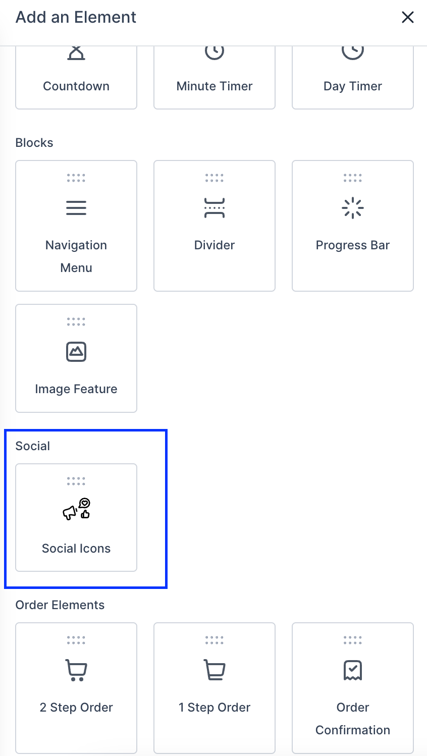 Social media icons comes under elements in Social category. Just drag and drop the element to the builder