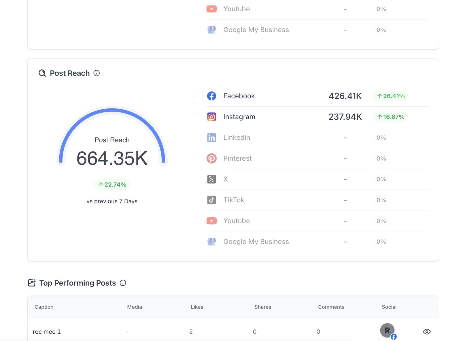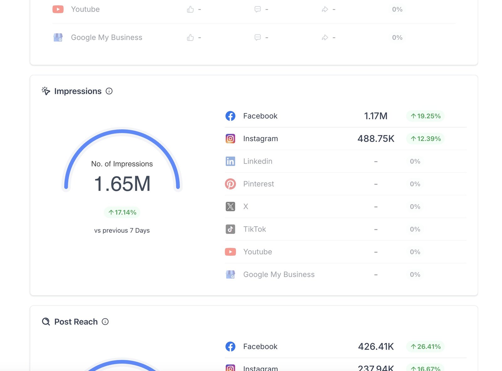- Analyze your Post Reach to understand how far your posts are spreading and which platforms are driving higher reach.