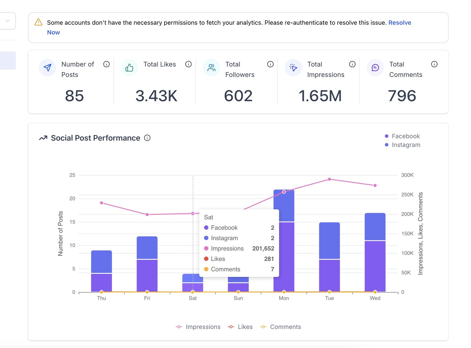 - Track the number of posts, likes, comments, followers, impressions, and reach across both Facebook and Instagram.