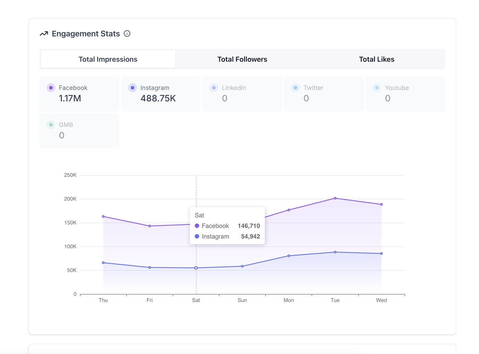 - Get a detailed view of engagement metrics such as total likes, comments, and shares, broken down per platform.